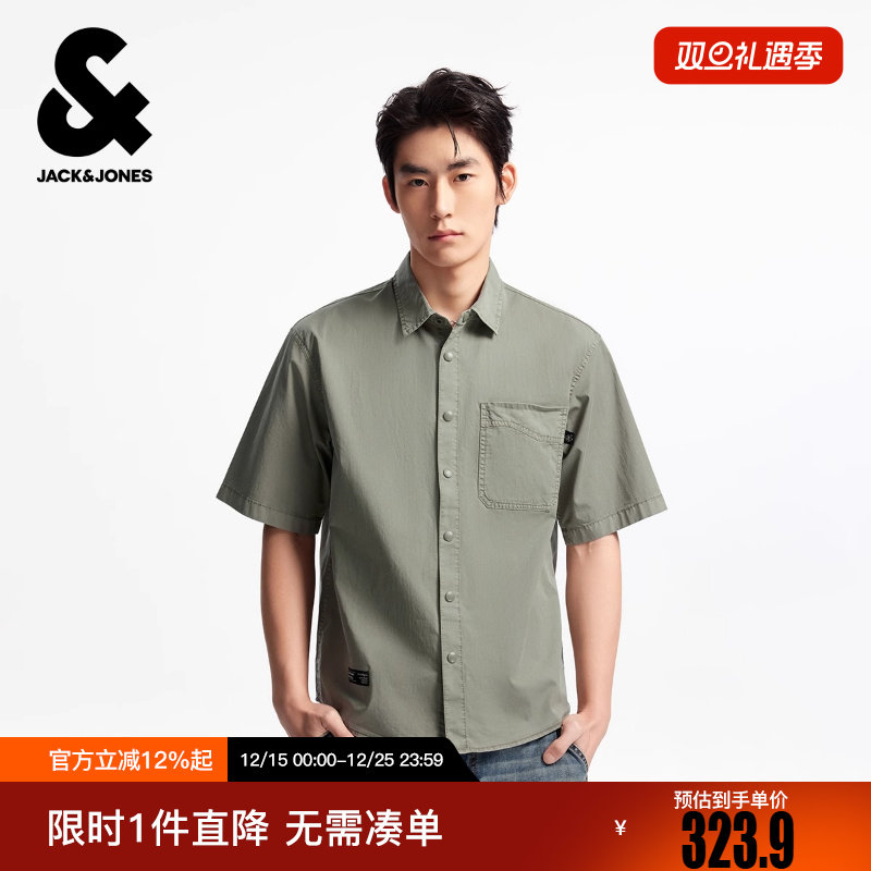 杰克琼斯男装冬新款百搭时尚简约贴布宽松休闲翻领短袖衬衫上衣