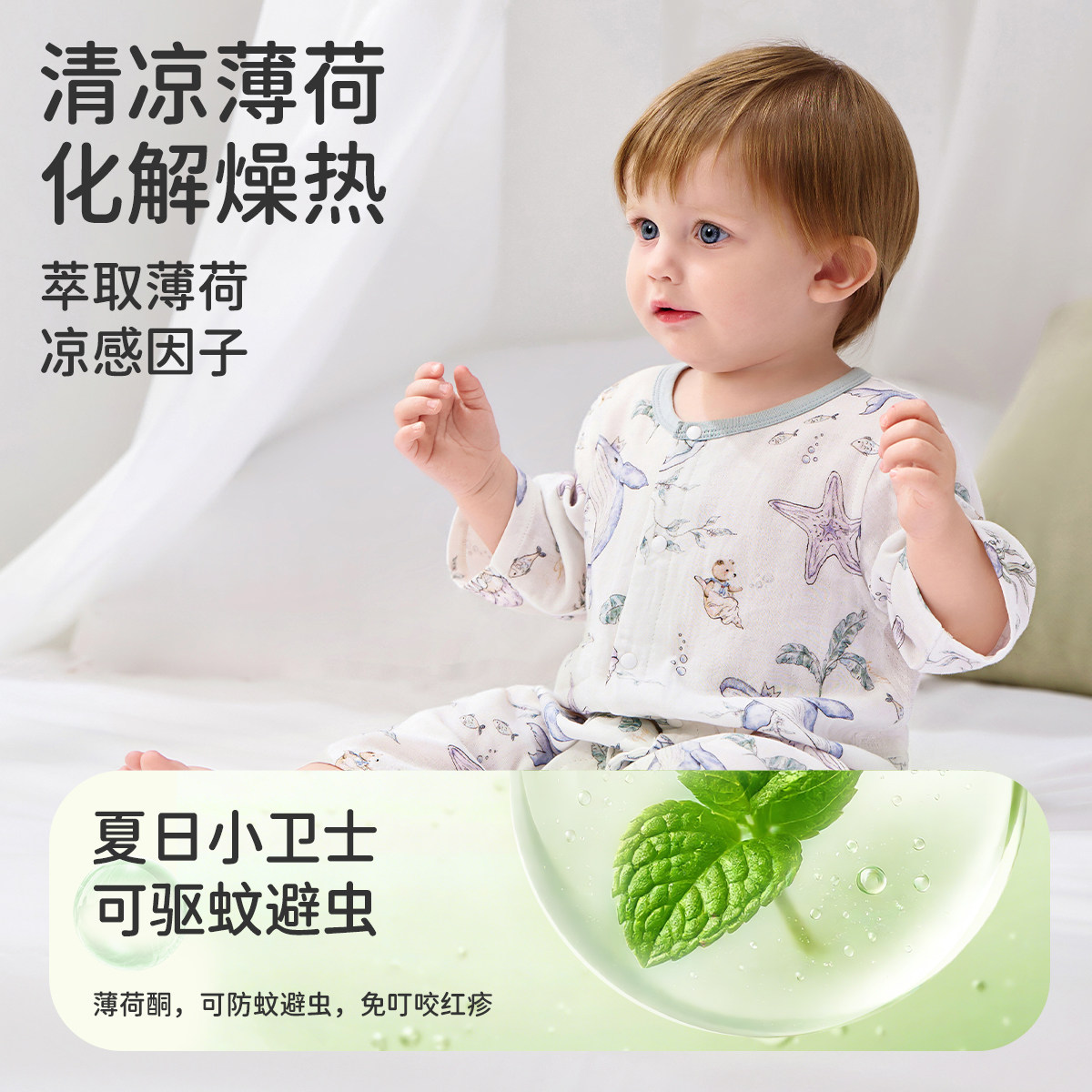 婧麒新生婴儿夏季薄款网眼连体衣满月男女宝宝竹棉透气对开爬爬服