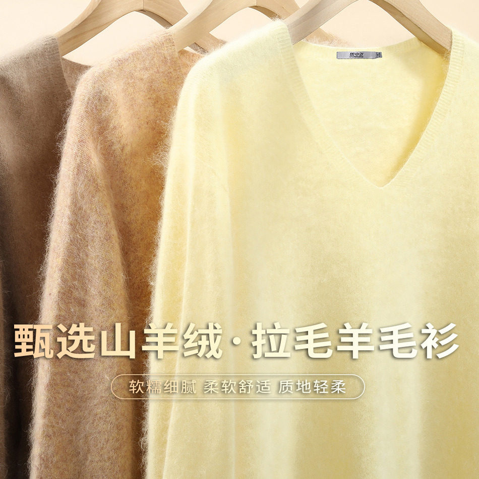 雪中飞冬新品【含山羊绒】拉毛款V领羊毛衫女打底纯色日常休闲