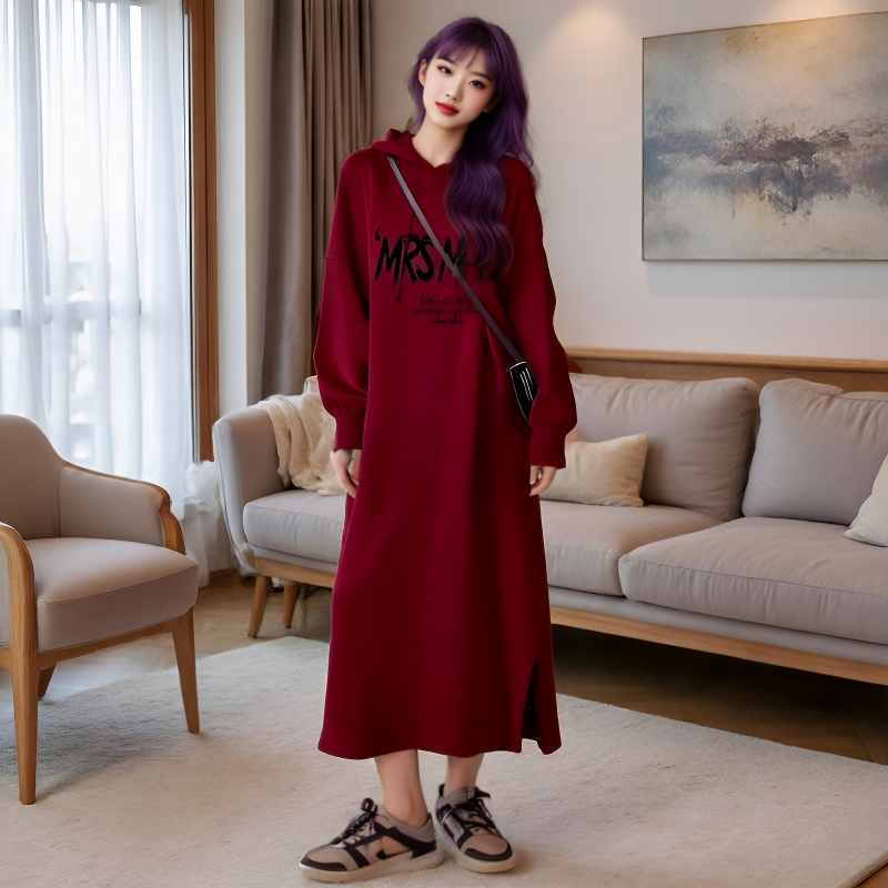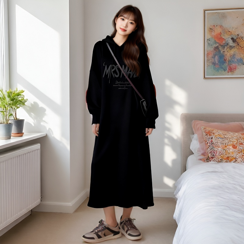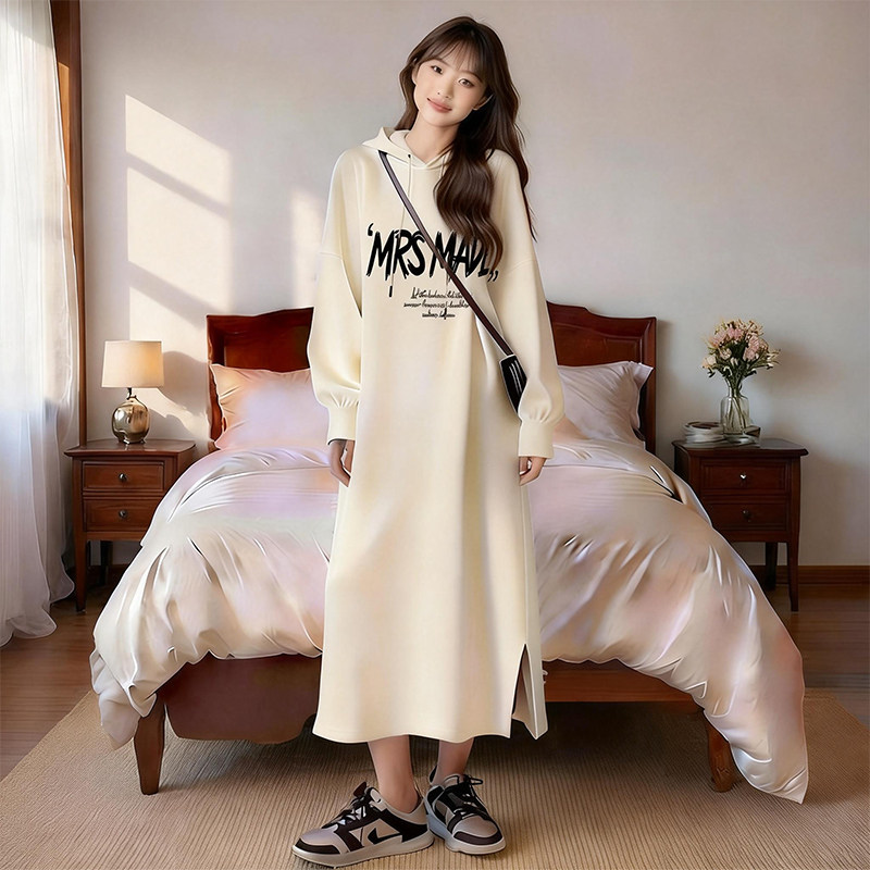 孕妇装慵懒风纯棉连帽卫衣裙2026新款宽松显瘦字母印花长款连衣裙