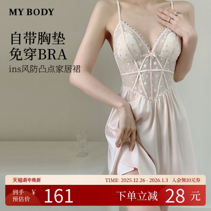 MYBODY商场同款吊带睡裙女带胸垫性感纯欲禁欲系露背蕾丝网纱睡衣