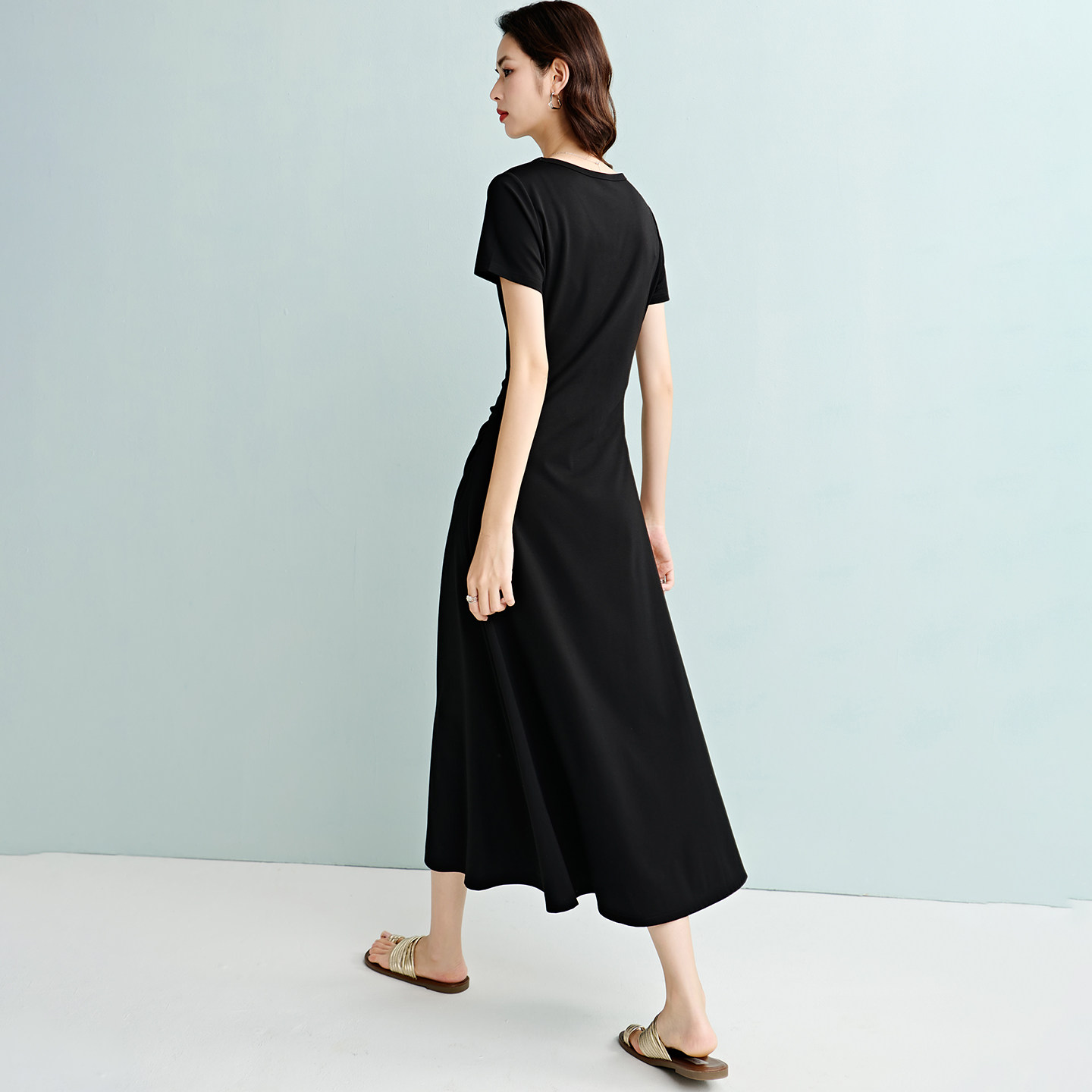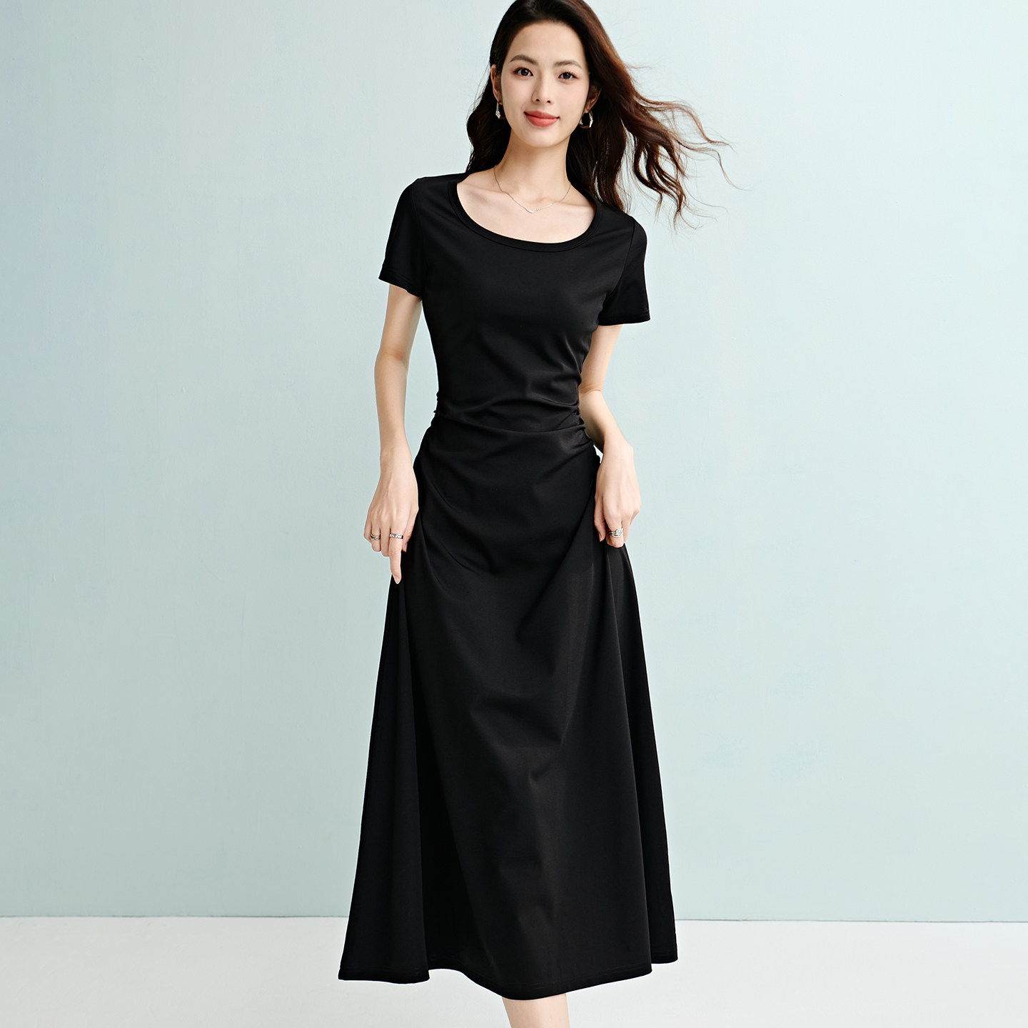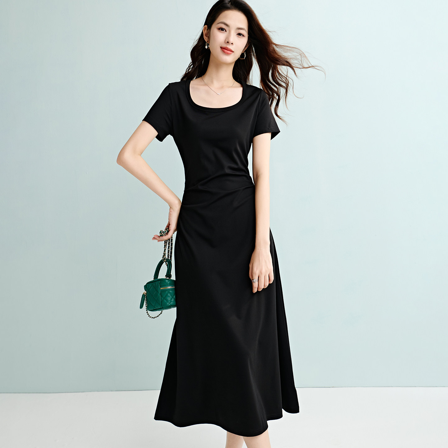 【热销补货】欧时力 褶皱短袖连衣裙女2026春新款收腰显瘦小黑裙