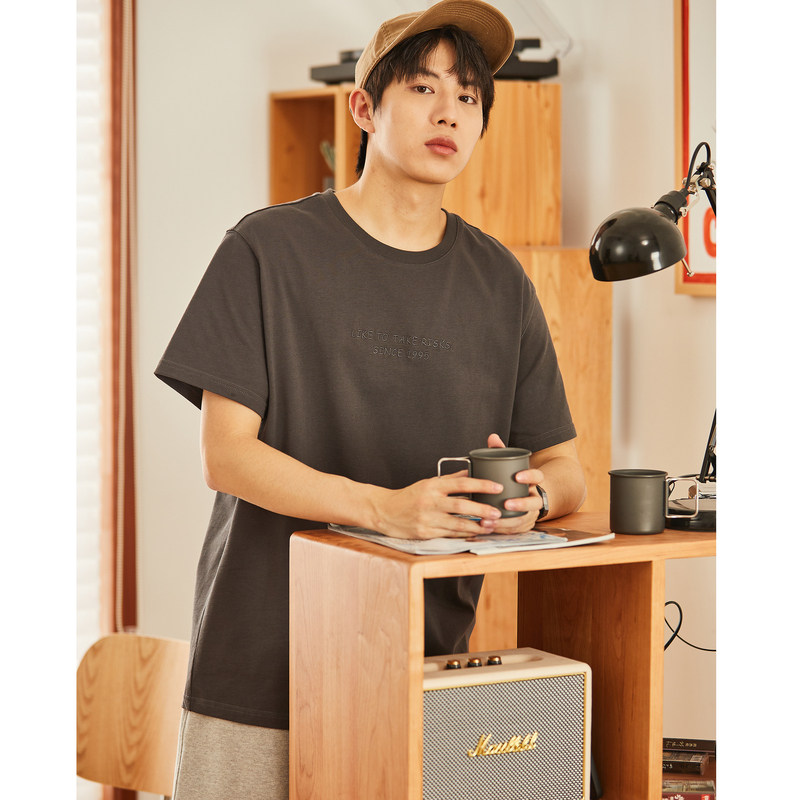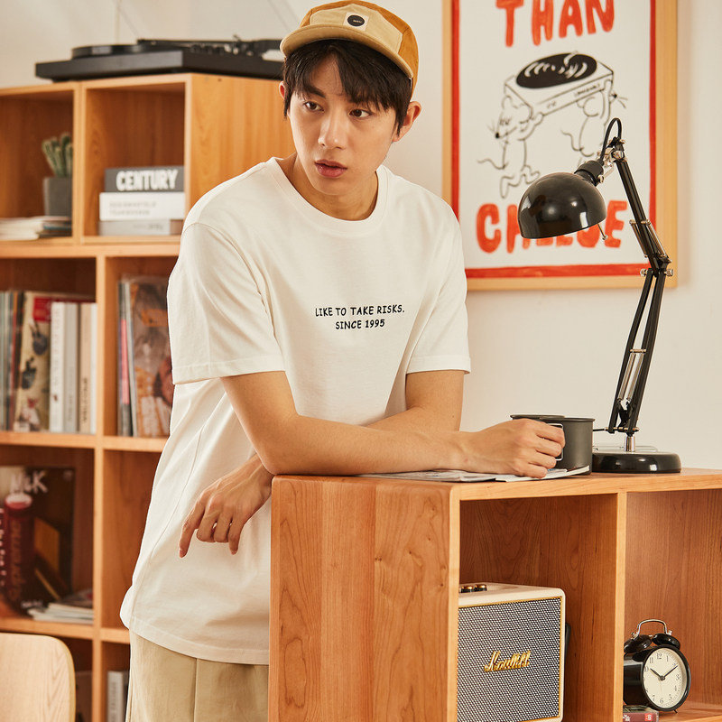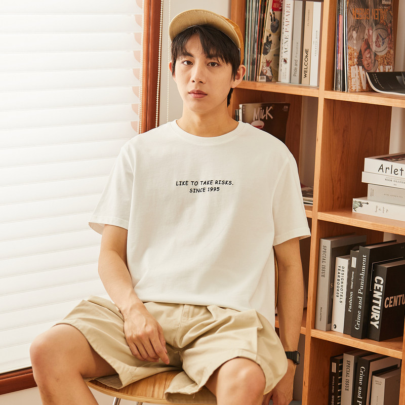 唐狮夏季纯棉短袖T恤男前胸小细节绣花圆领短袖T恤宽松白色复古
