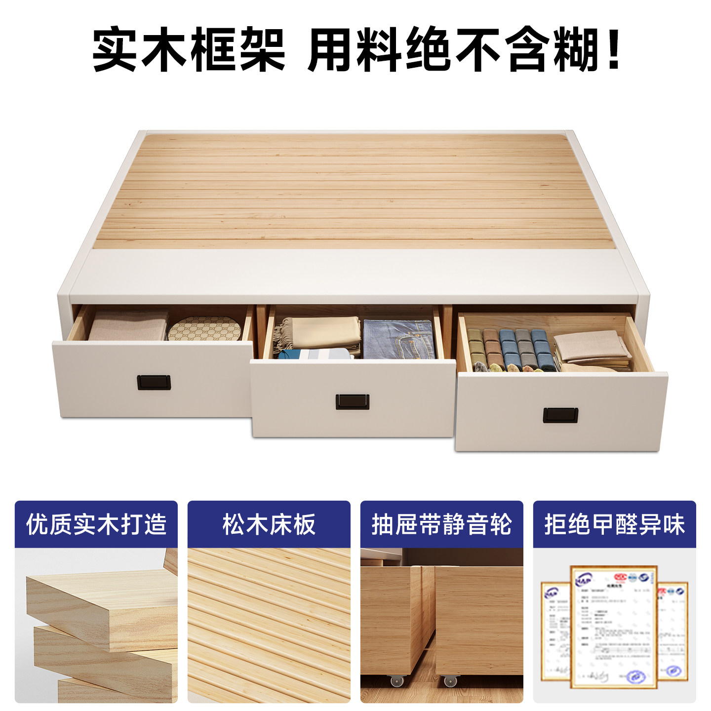 全实木无床头小户型双人床简约三抽储物落地榻榻米床可支持定制