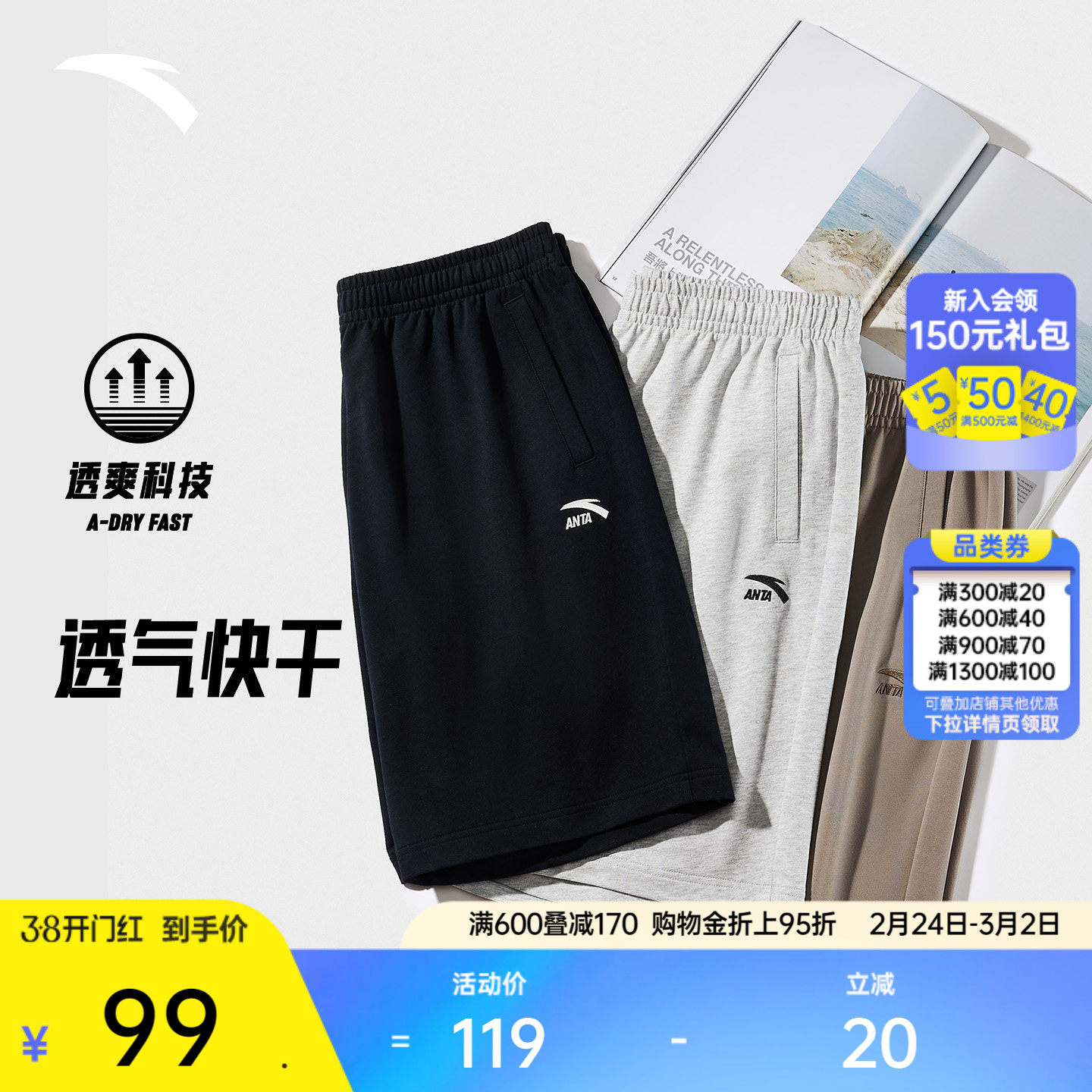 安踏冰丝短裤男士夏季新款宽松透气薄休闲男裤健身潮流运动五分裤