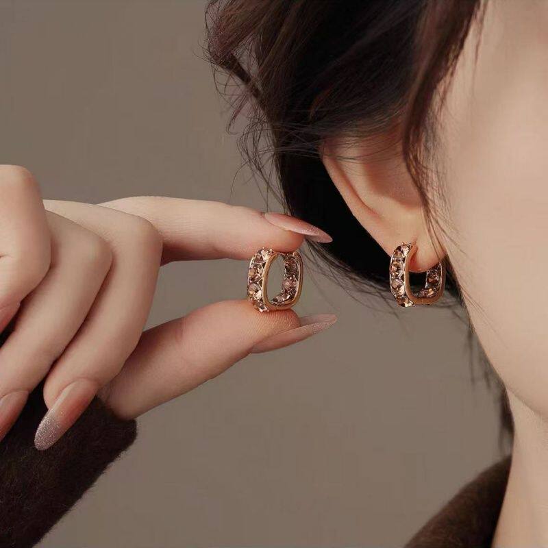 轻奢高级感咖色满钻方形耳扣女复古港风耳环时尚气质百搭超闪耳饰