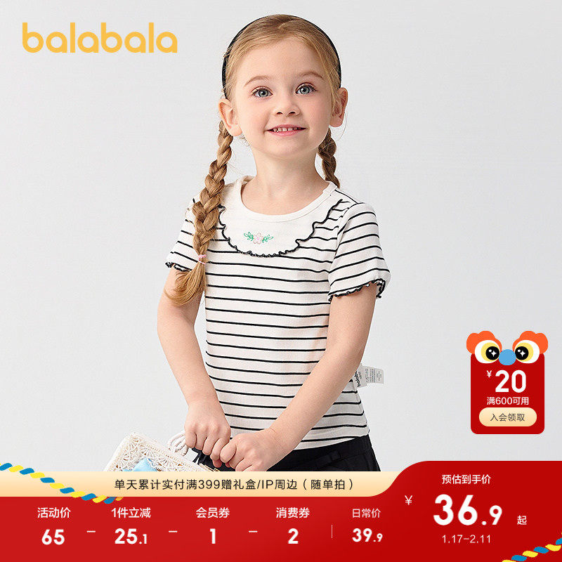 巴拉巴拉童装宝宝短袖女童T恤儿童上衣2025新款夏装正肩内搭绣花