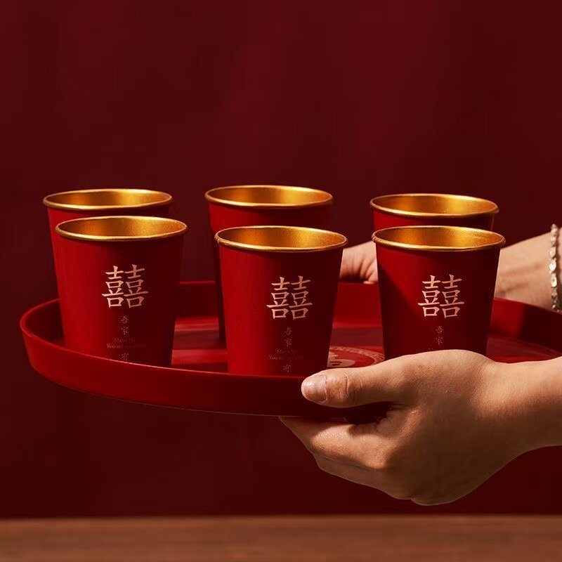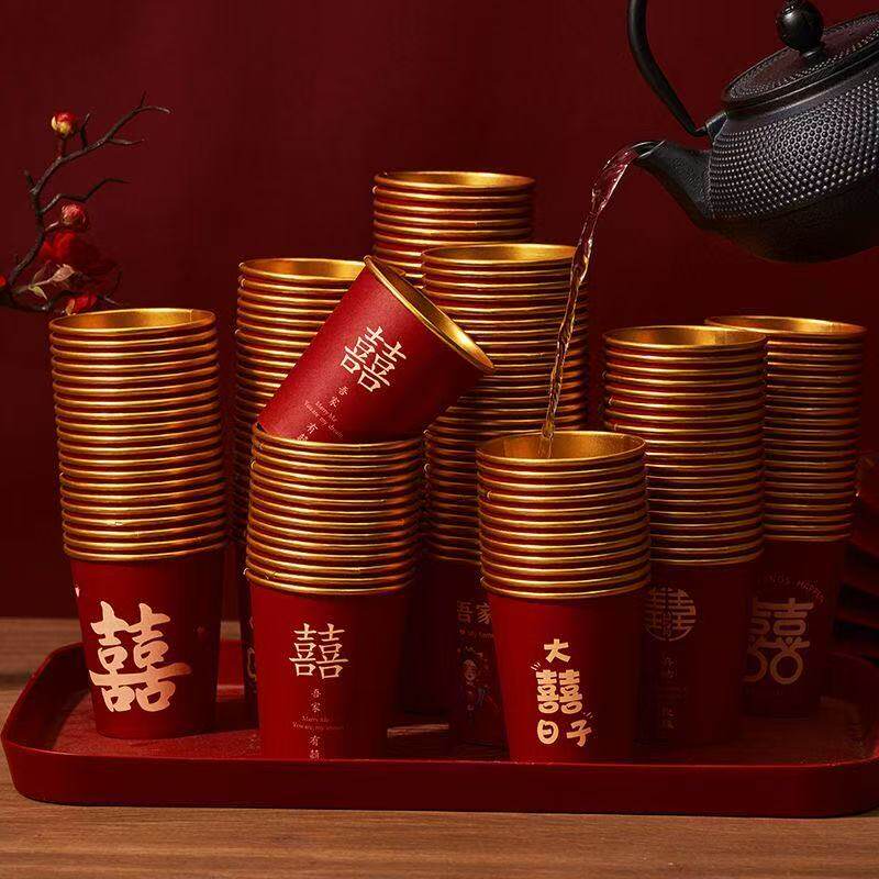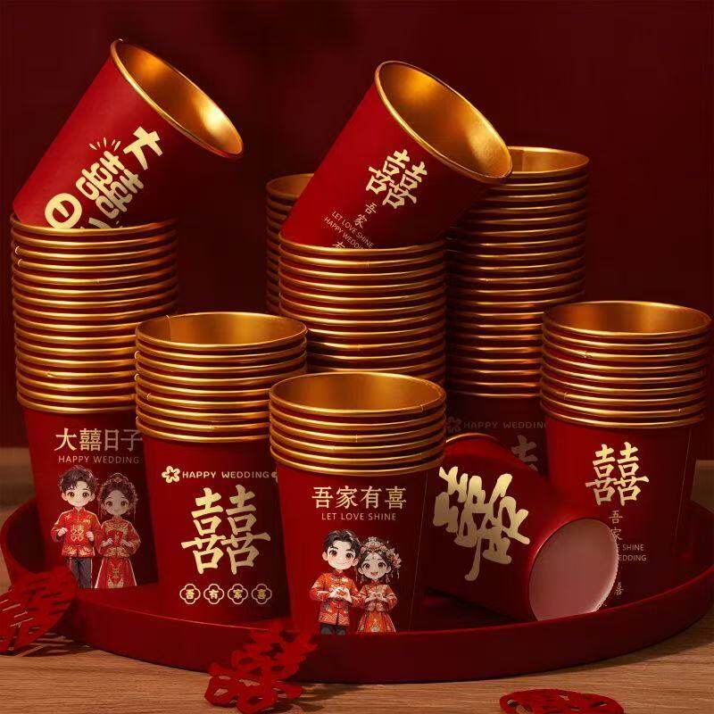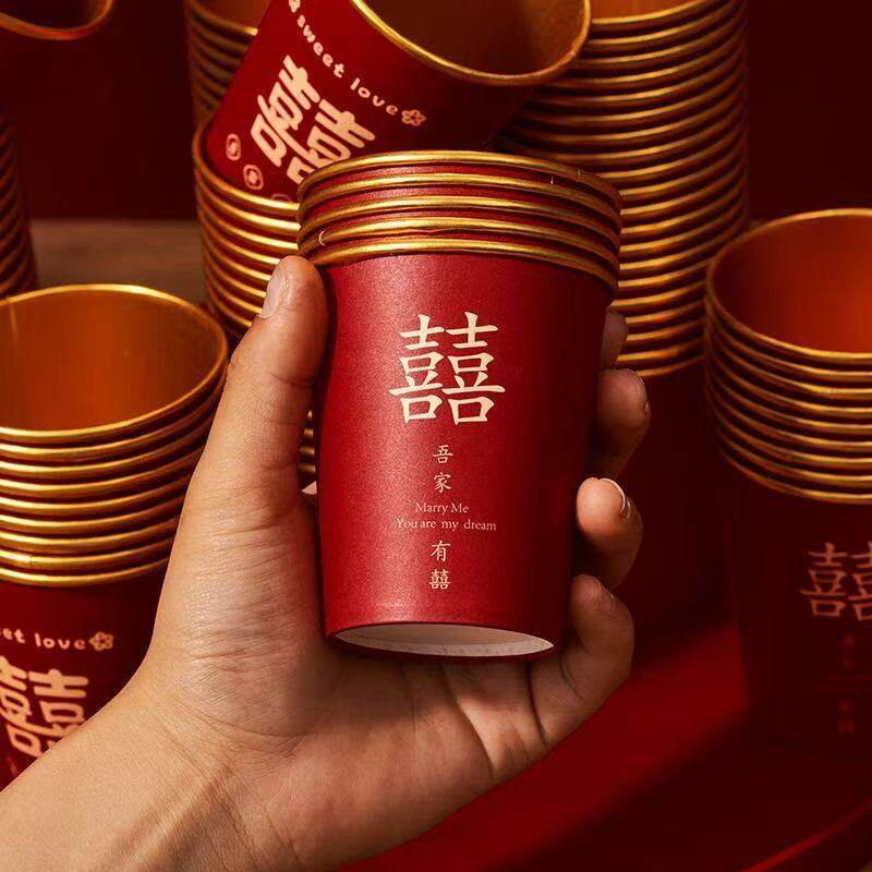 新款婚礼纸杯加厚结婚敬茶婚宴家用喜字红婚庆一次性水杯杯子茶杯