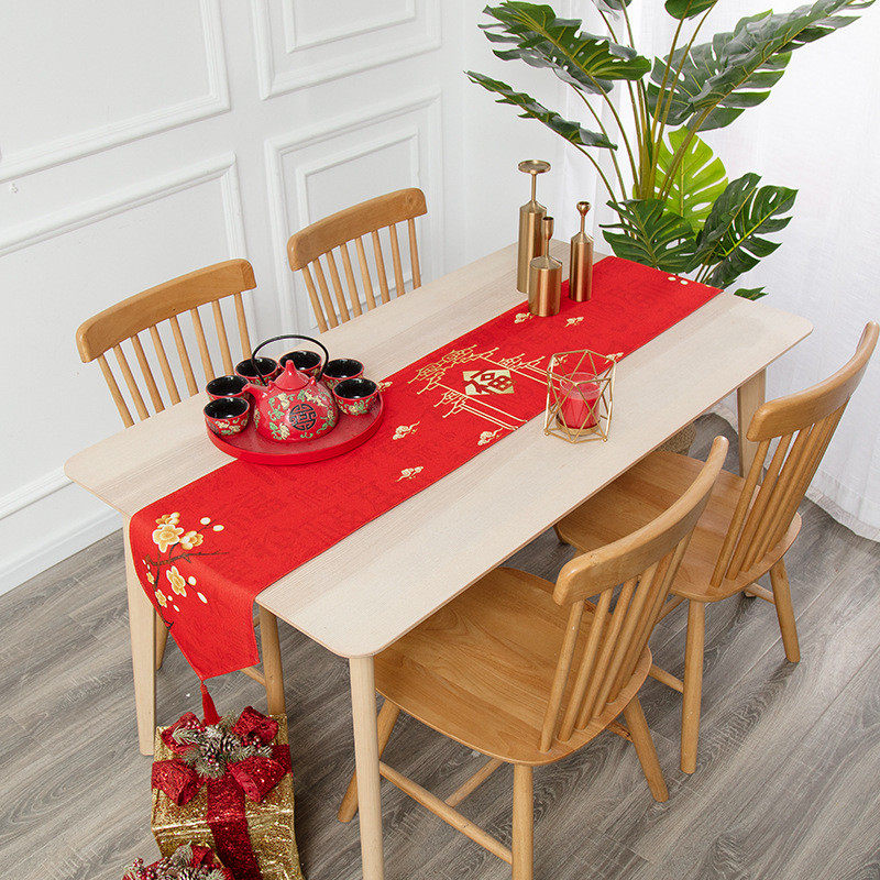 qjao批发过年喜庆红色长方形桌布新年餐厅气氛桌旗流苏棉麻电视柜