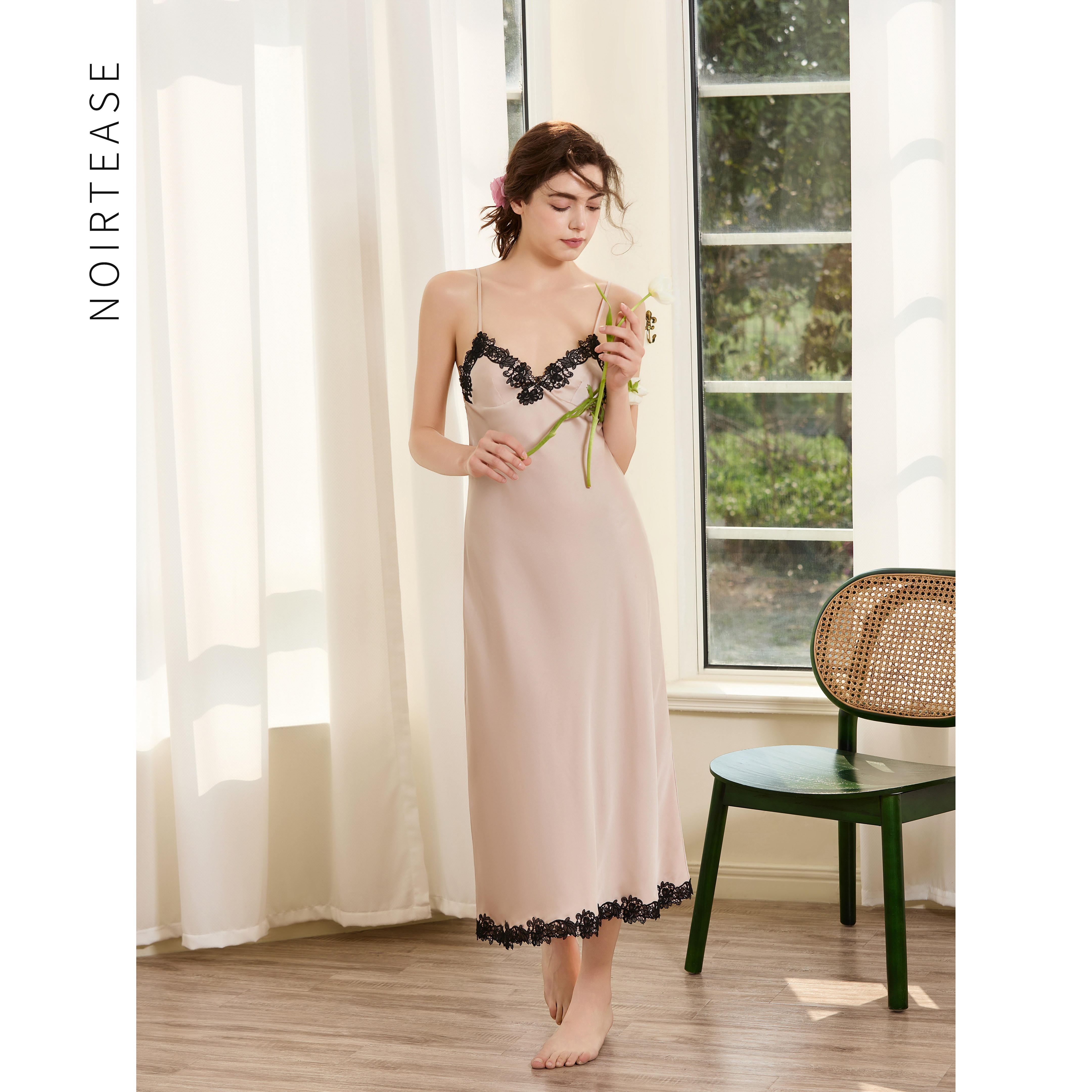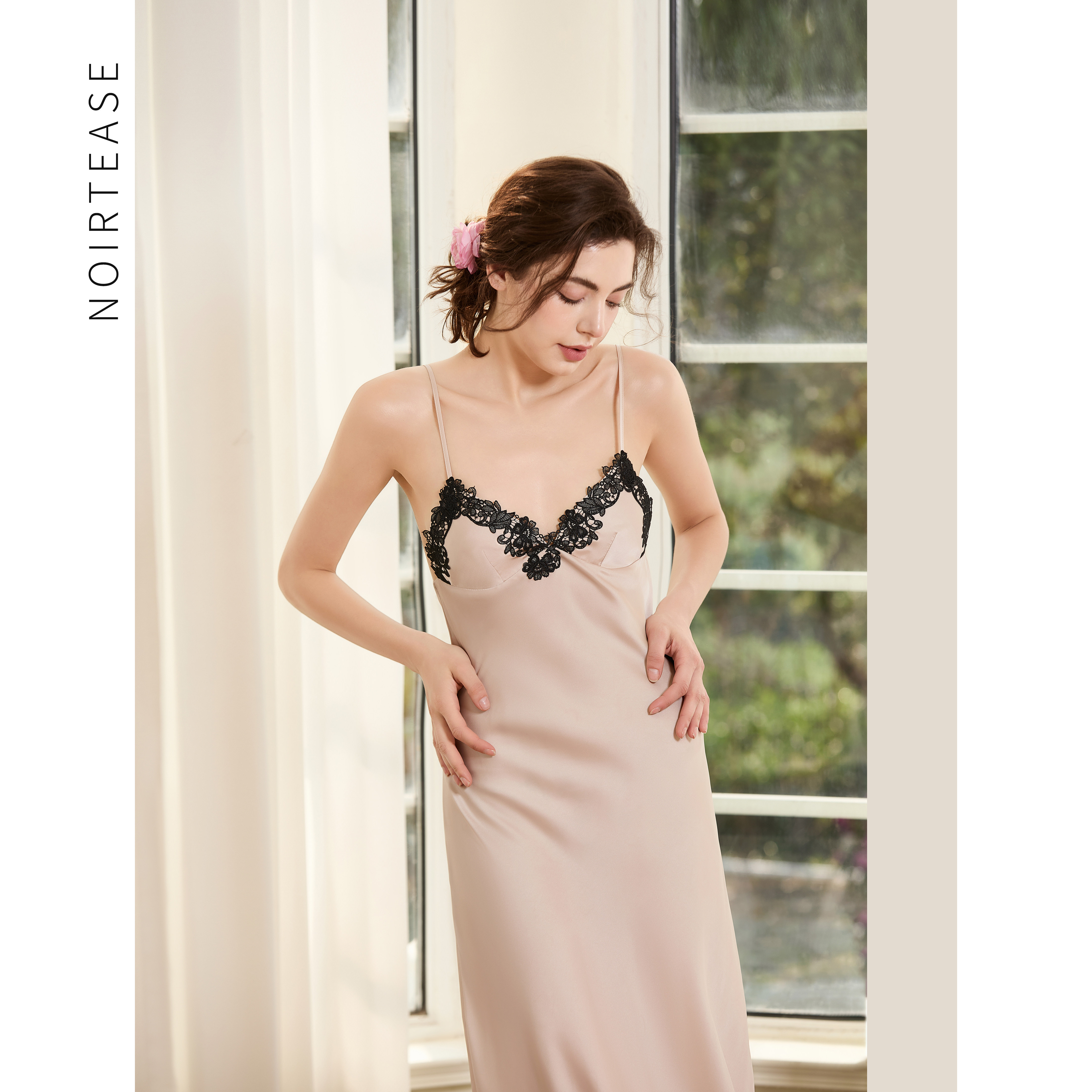 NoirTease夏季丝质薄款睡裙女士性感蕾丝V领中长款显瘦吊带睡衣裙