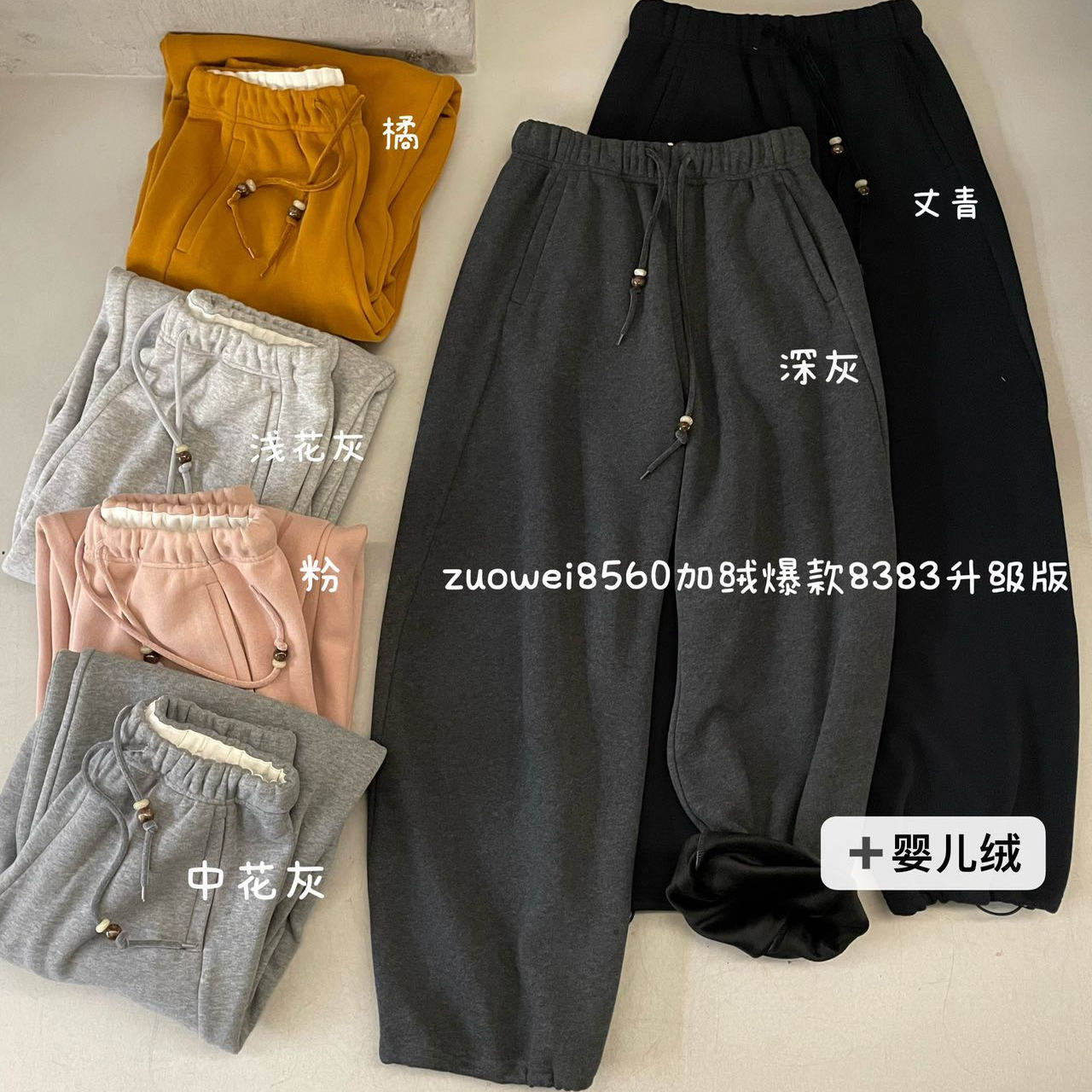 左维8560zuowooon加绒卫裤女2025秋冬松紧束脚抽绳刺绣直筒阔腿裤