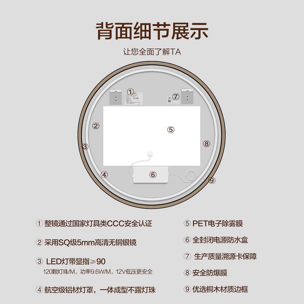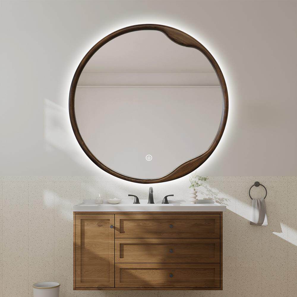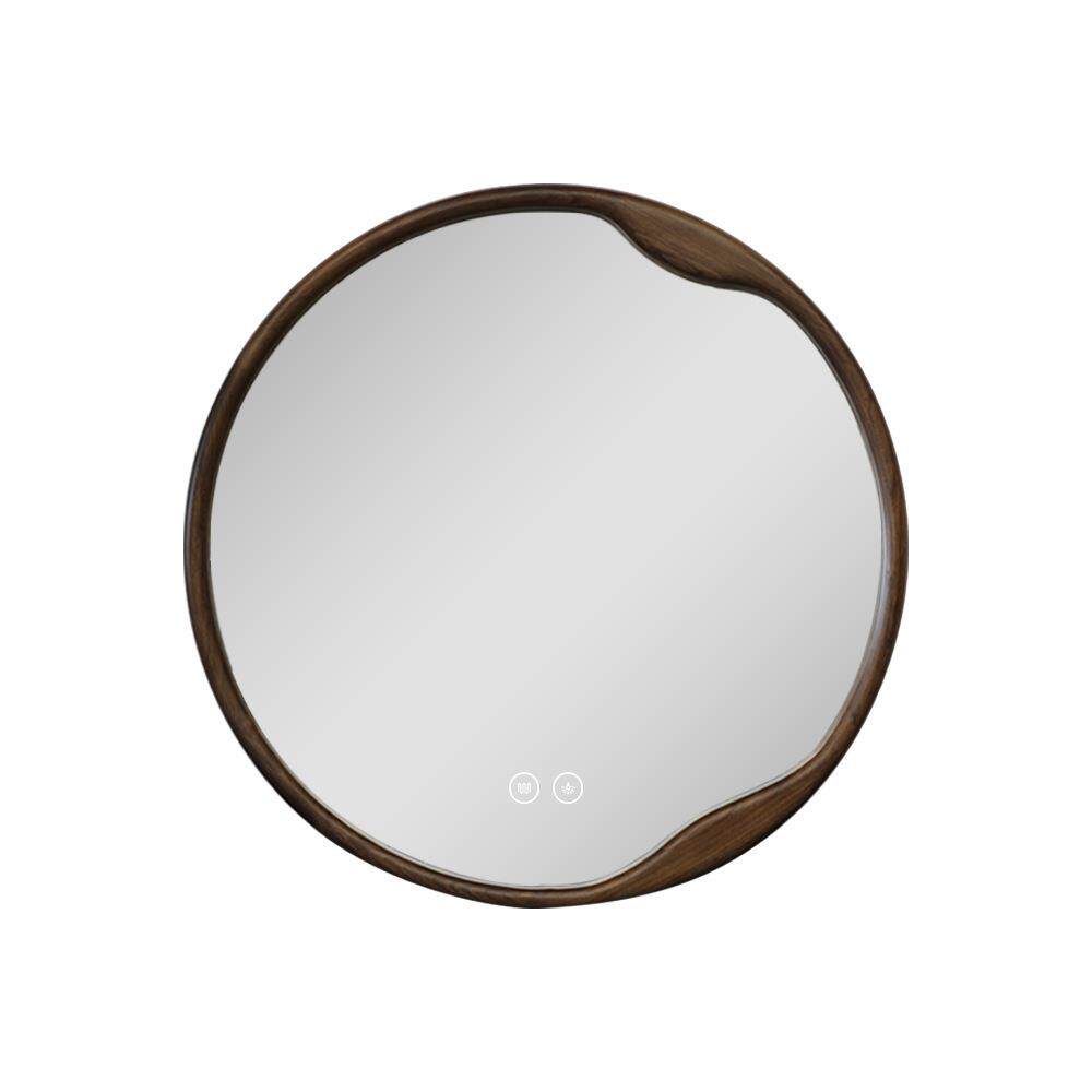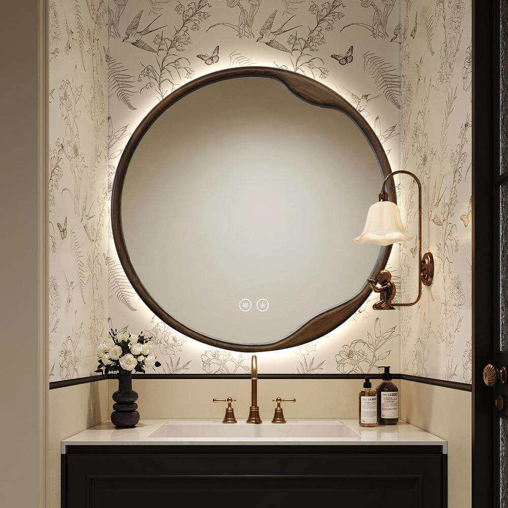 BOLEN圆形中古风实木智能浴室镜背面发光梳妆化妆镜卫生间圆镜子