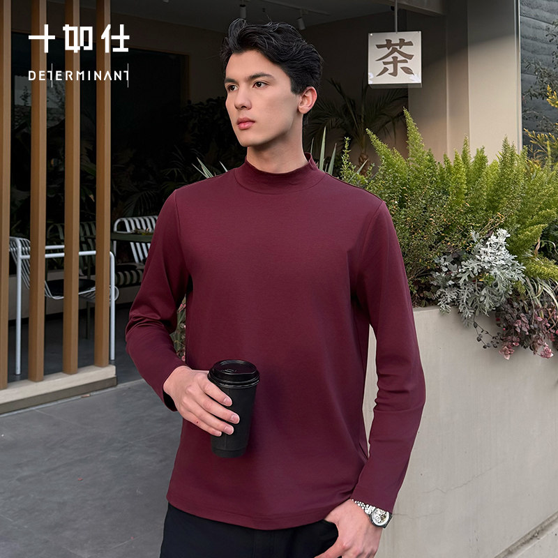 十如仕男女亲子家庭新年衣服酒红色半高领高领长袖T恤100%纯棉T04