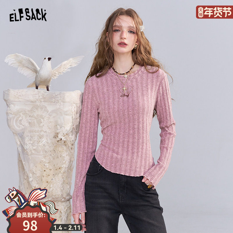 三福长袖上衣2025新款秋季圆领修身针织衫简约纯色内搭打底衫女装
