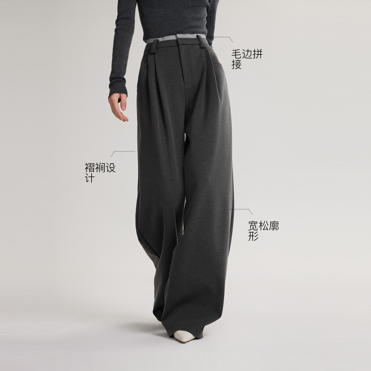 ELLE深灰色绵羊毛混纺阔腿休闲裤女2025冬装新款慵懒松弛感西裤