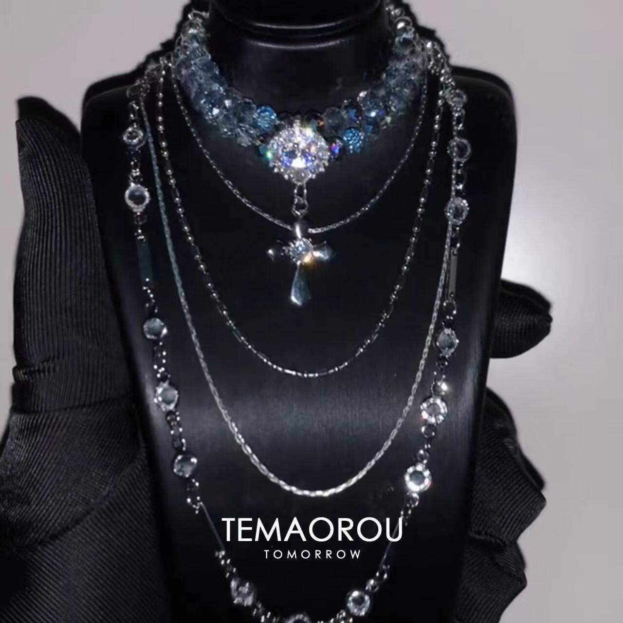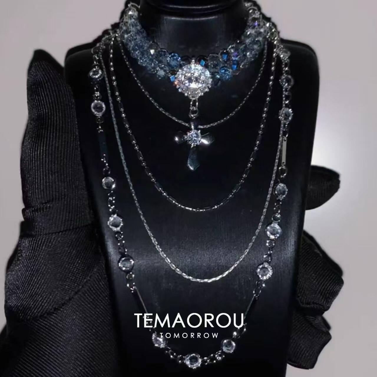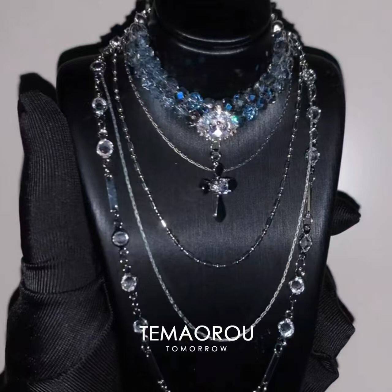 diy自制干净清冷色多层银蓝灰闪钻十字架项链女晚会配饰宴会颈链