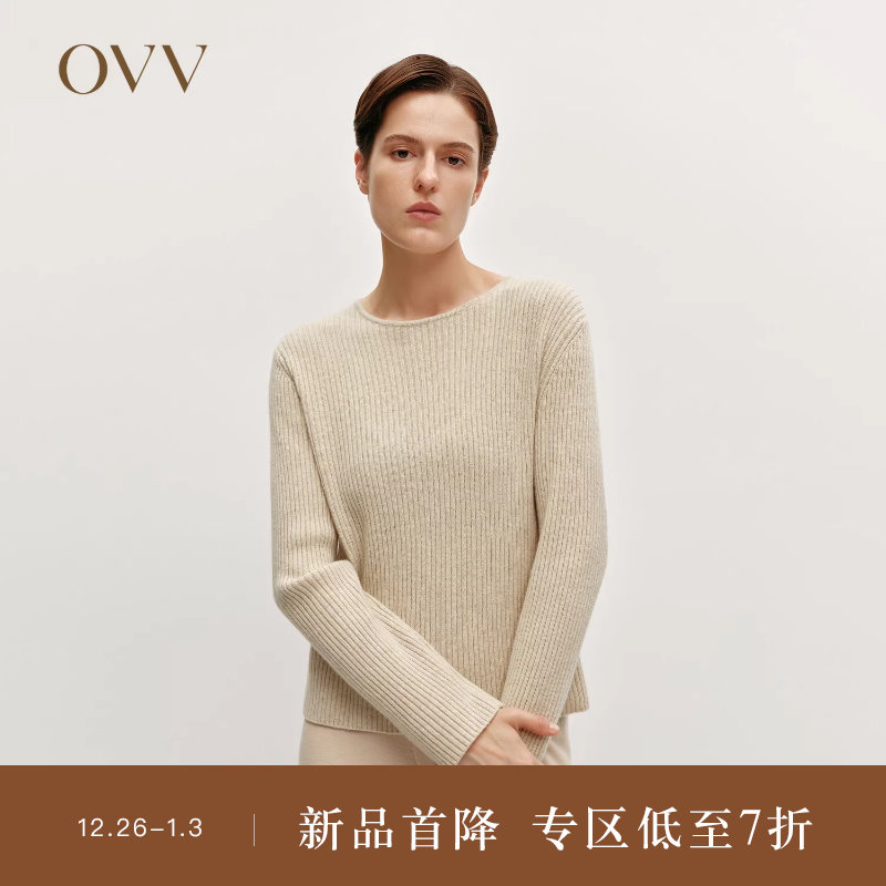 OVV秋冬热卖女装羊毛羊绒混纺圆领竖条纹肌理长袖针织衫