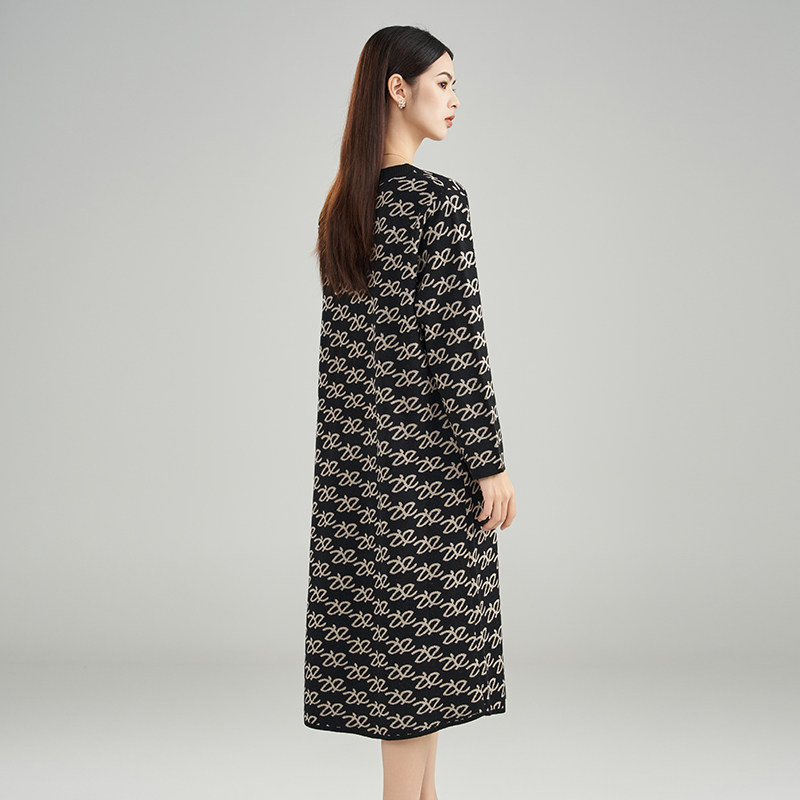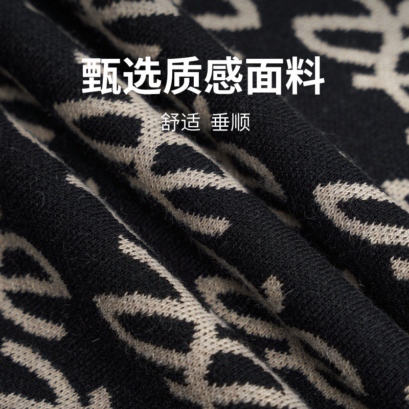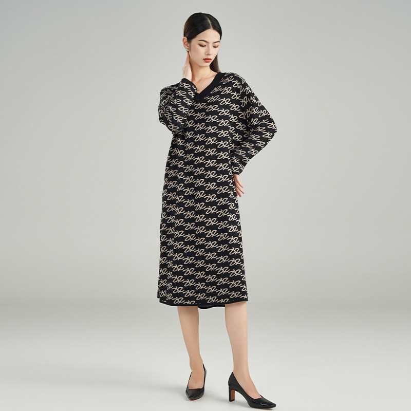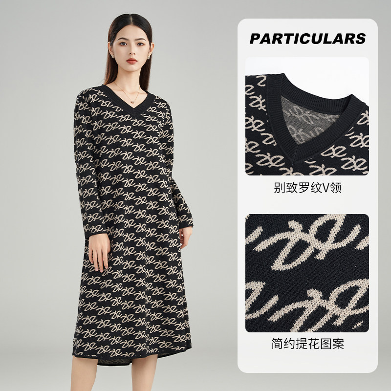 马天奴女秋冬新款撞色V领提花针织裙长袖连衣裙松弛感长裙子时尚