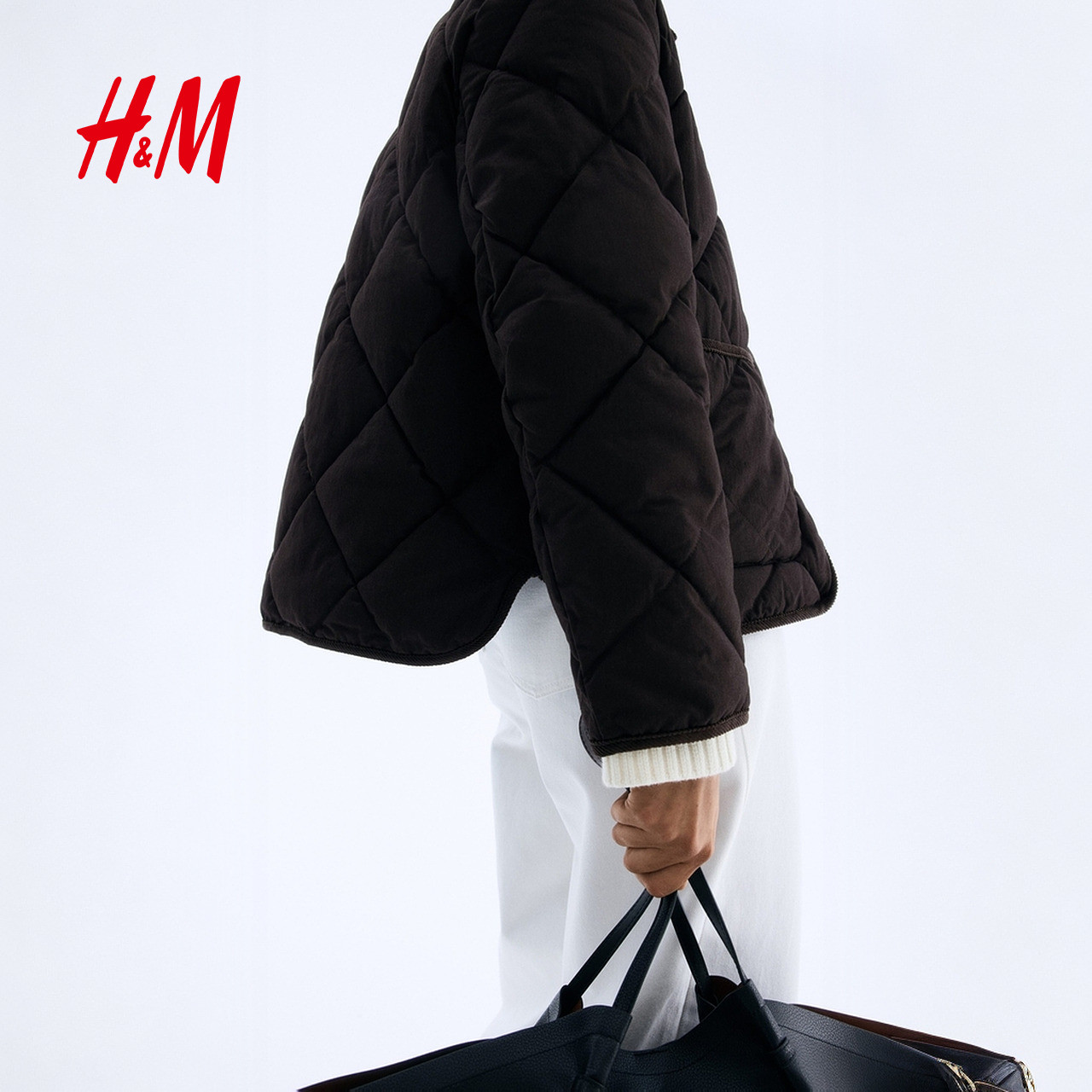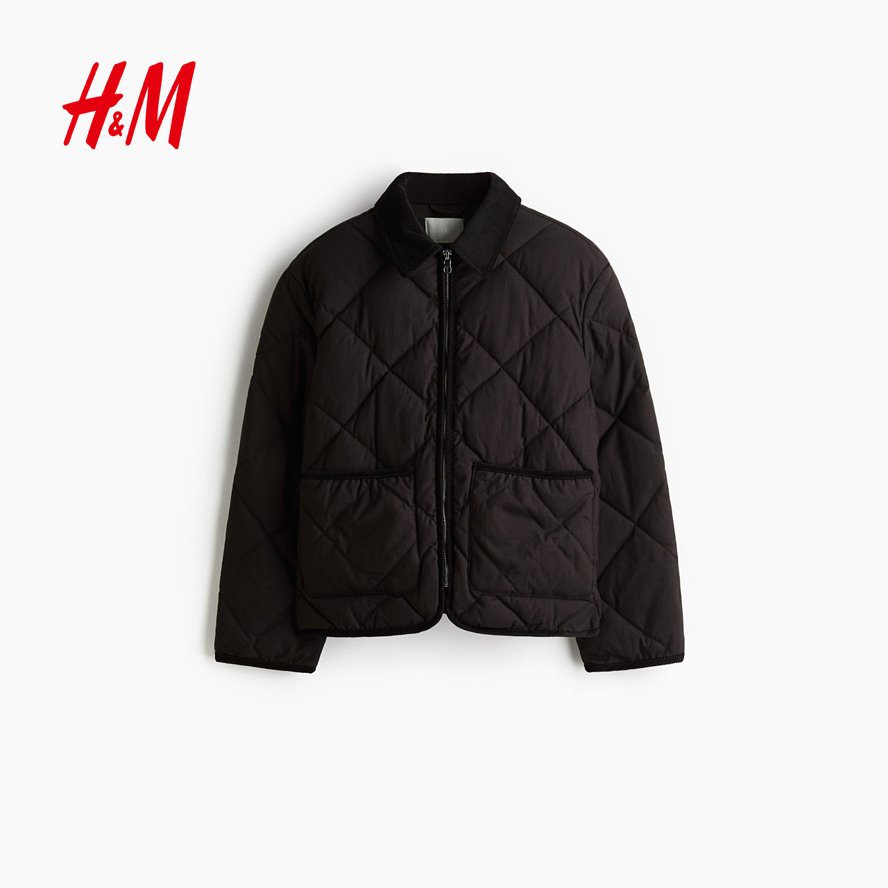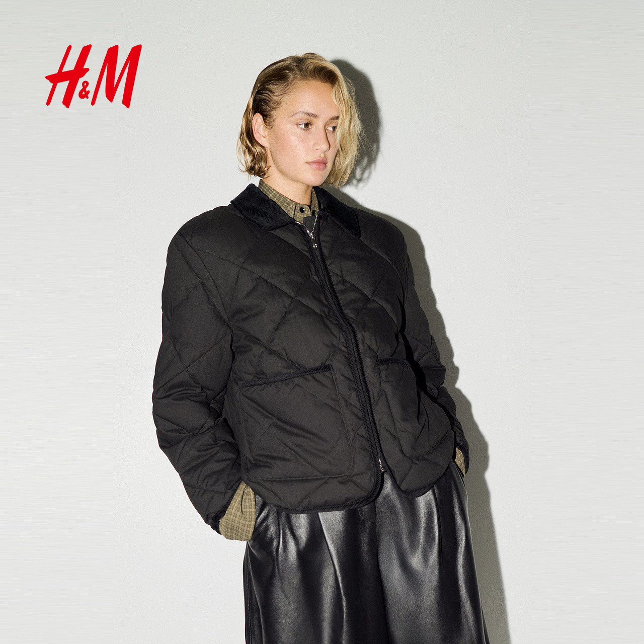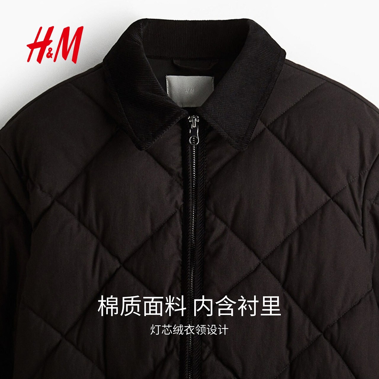 HM女装菱格纹棉服2025冬季新款绗缝灯芯绒翻折领保暖外套1265267