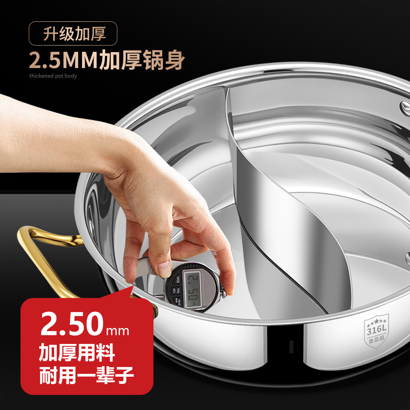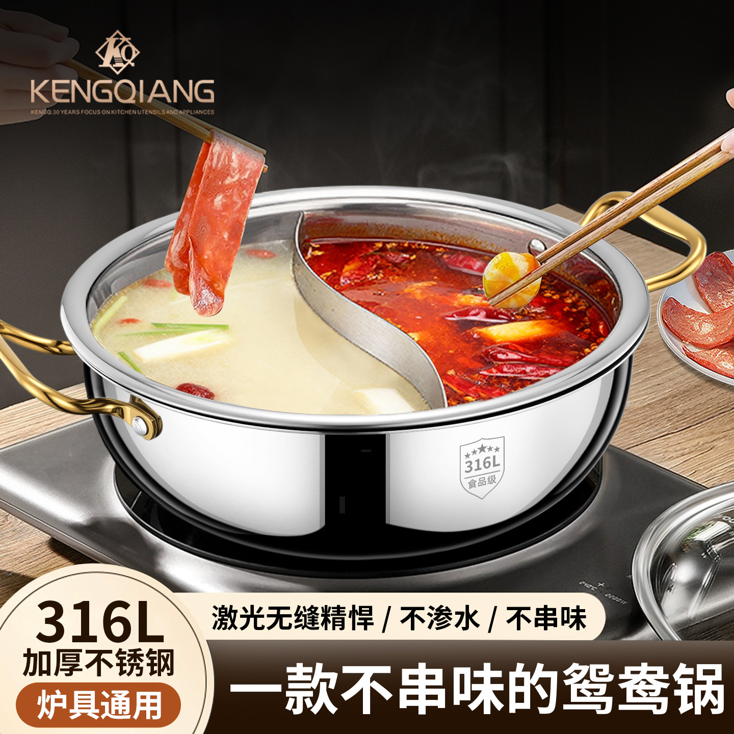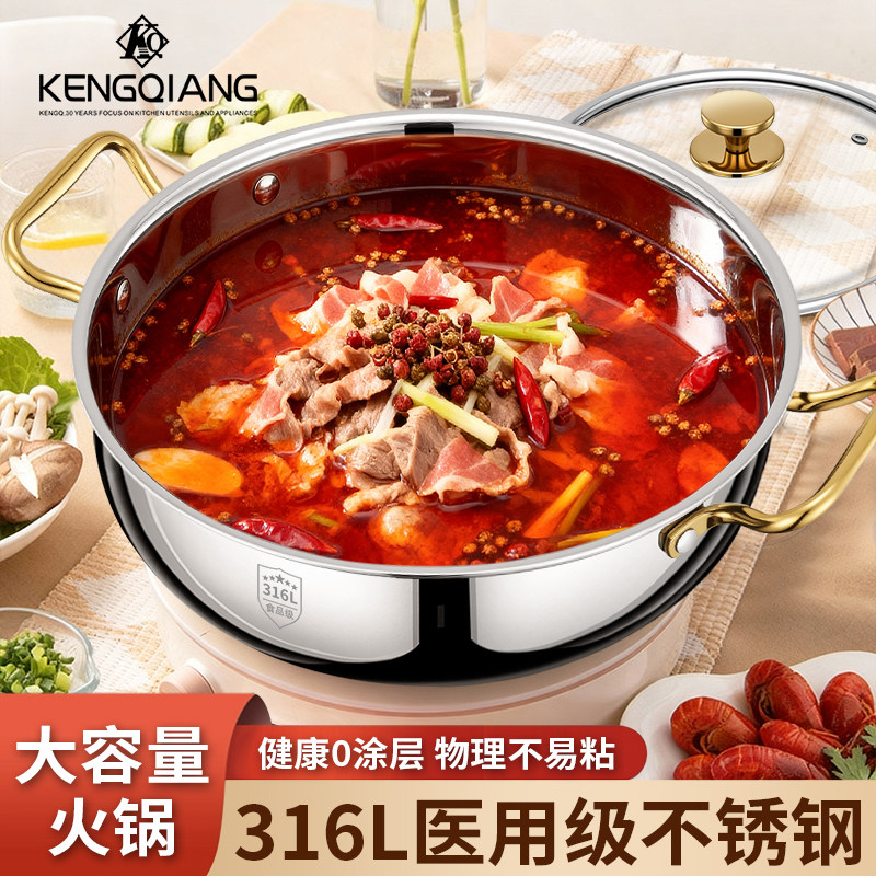 铿锵316L不锈钢鸳鸯锅火锅家用大容量加厚双耳清汤锅电磁炉专用