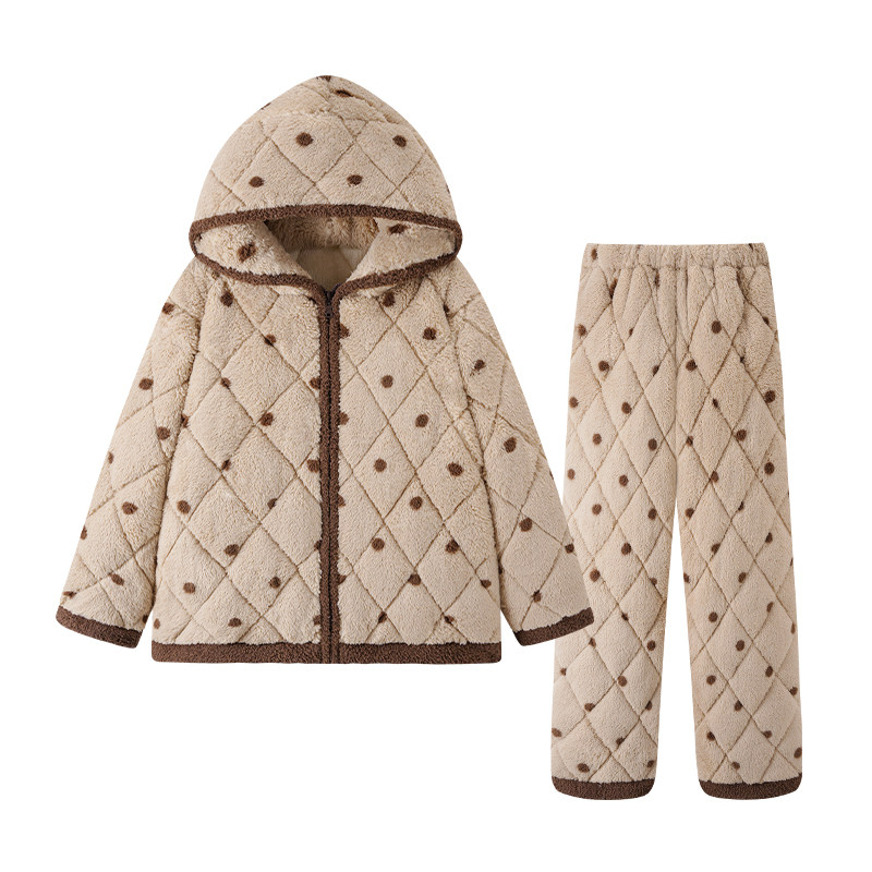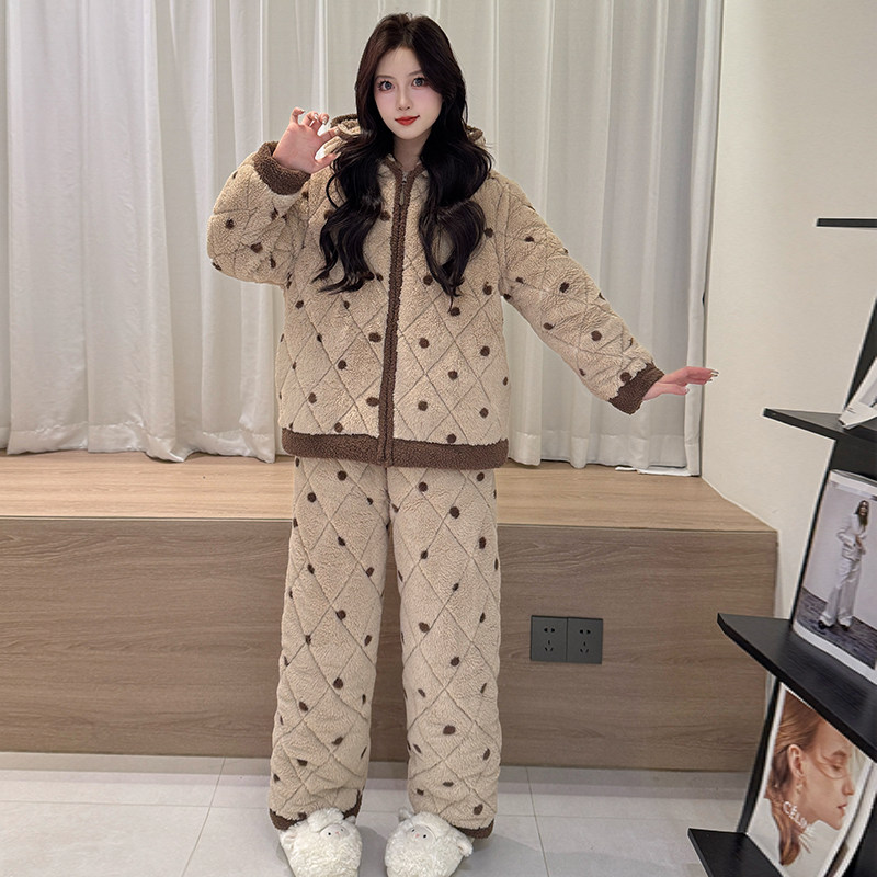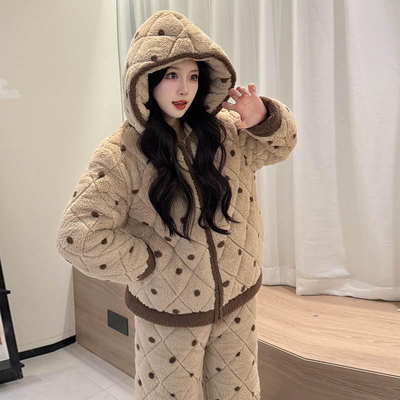 三层夹棉睡衣女款冬季ins风加绒加厚珊瑚绒可外穿女士连帽家居服