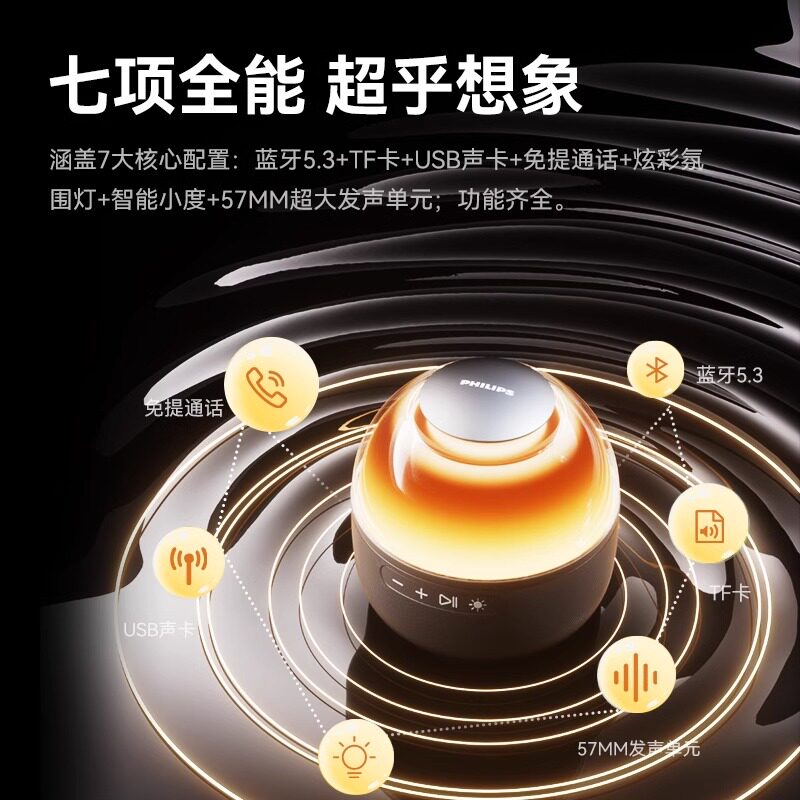 飞利浦无线蓝牙音箱桌面便携小音响AI智能语音炫彩户外家用低音炮