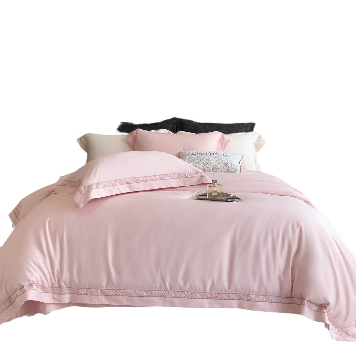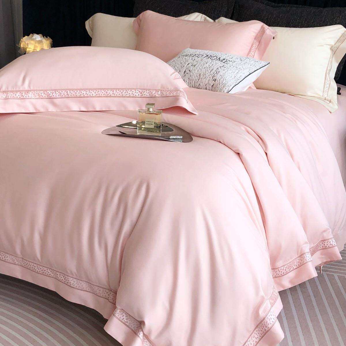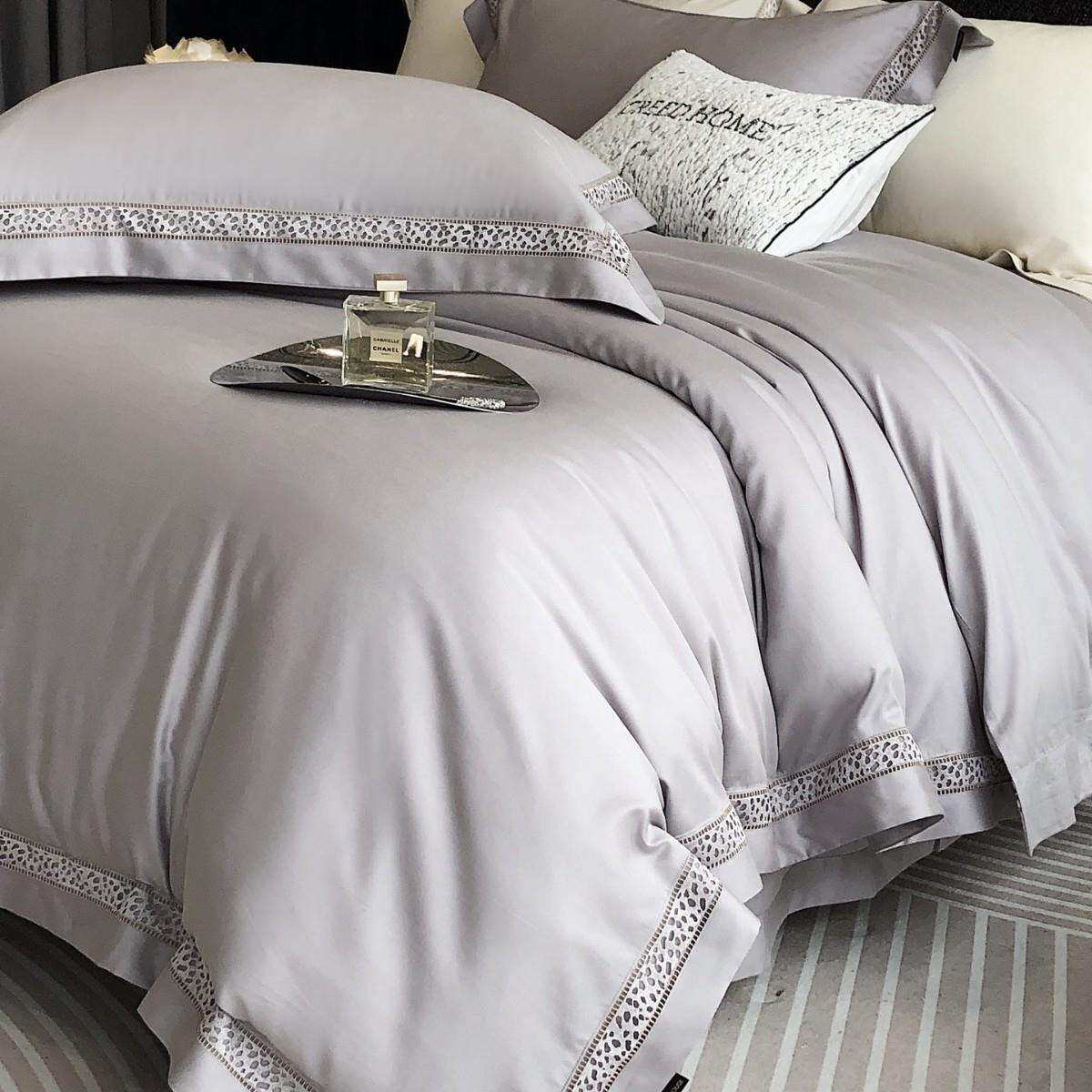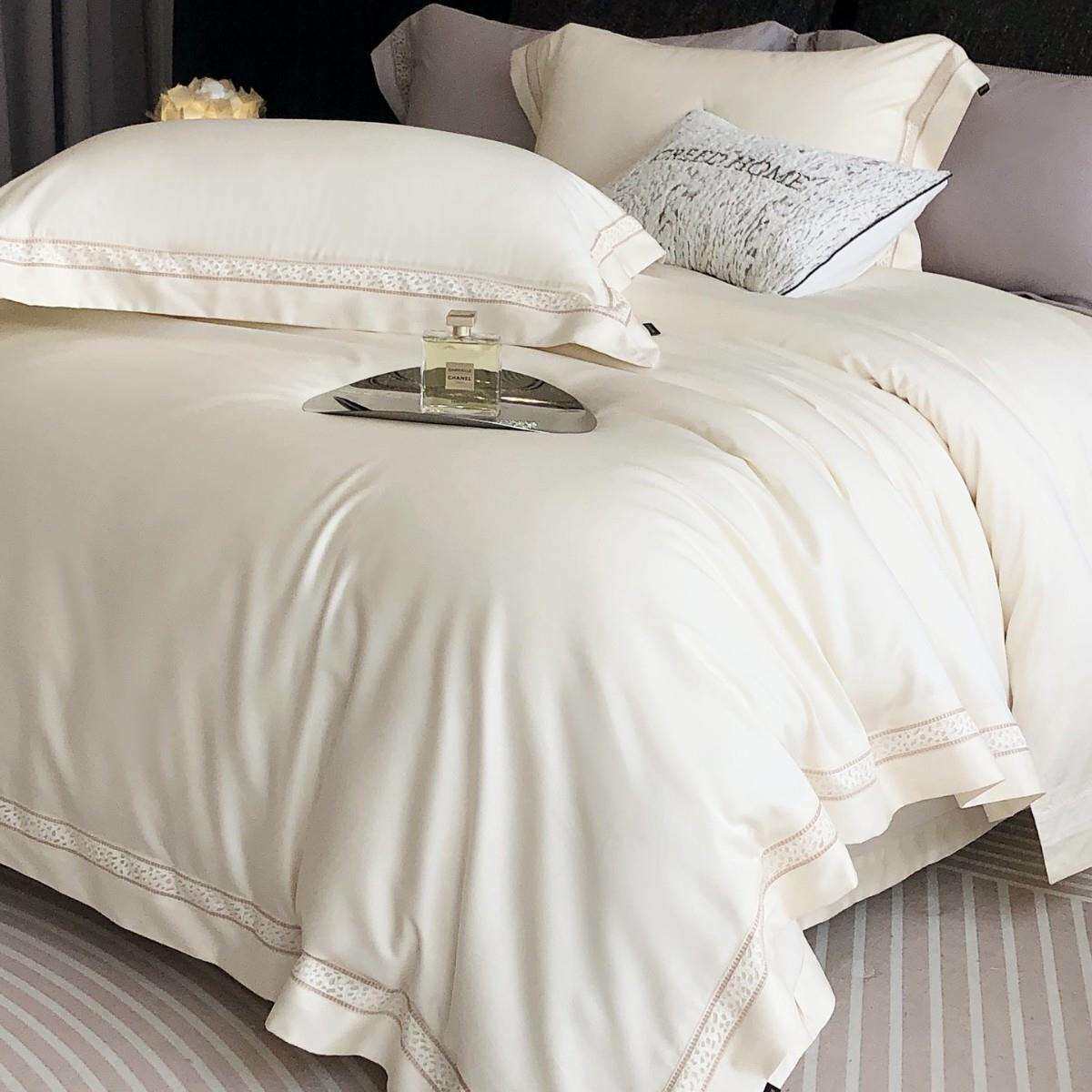 简约60超细旦天丝棉磨毛四件套纯色镂空织带被套床单1.8m床上用品