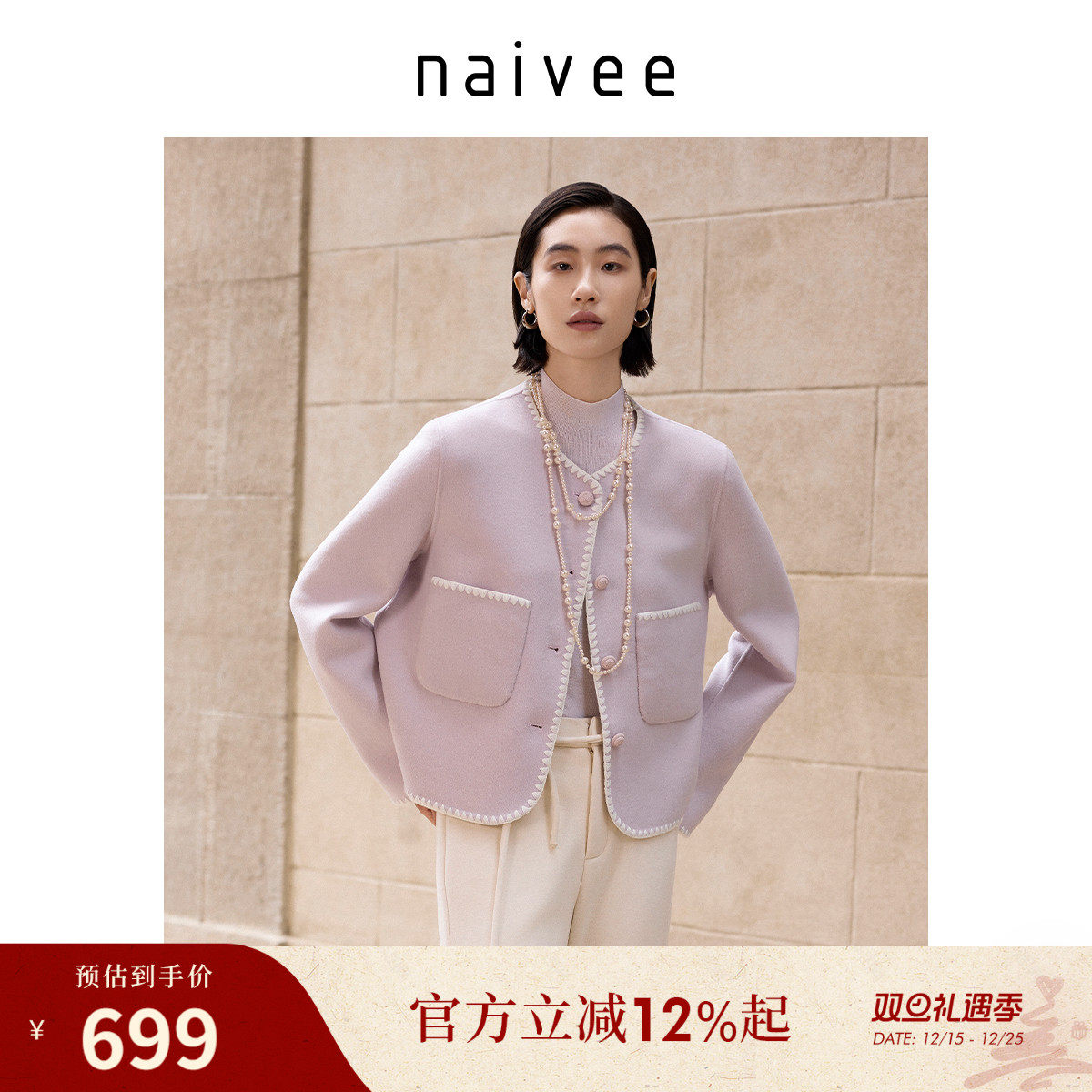 naivee纳薇小香风外套绵羊毛双面呢无领大衣毛呢短款外套女