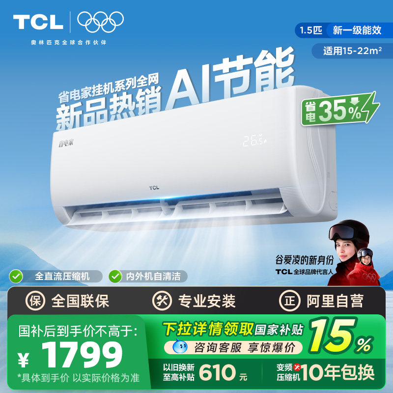 TCL空调省电家大1.5匹挂机变频冷暖新一级壁挂式以旧换新补贴 340