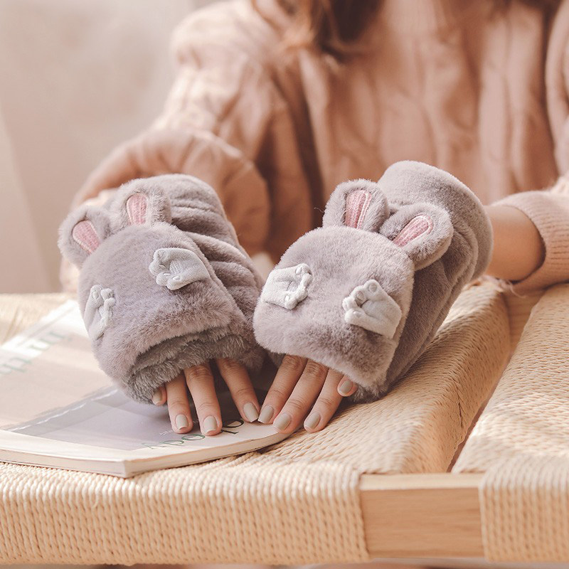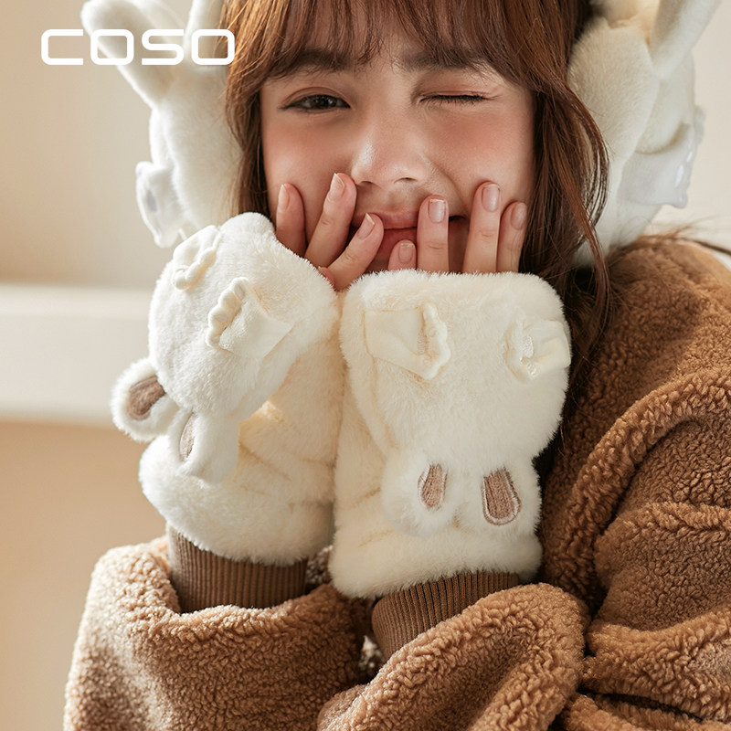COSO可爱兔子耳朵毛绒手套女生冬季保暖学生加绒加厚半指翻盖连指