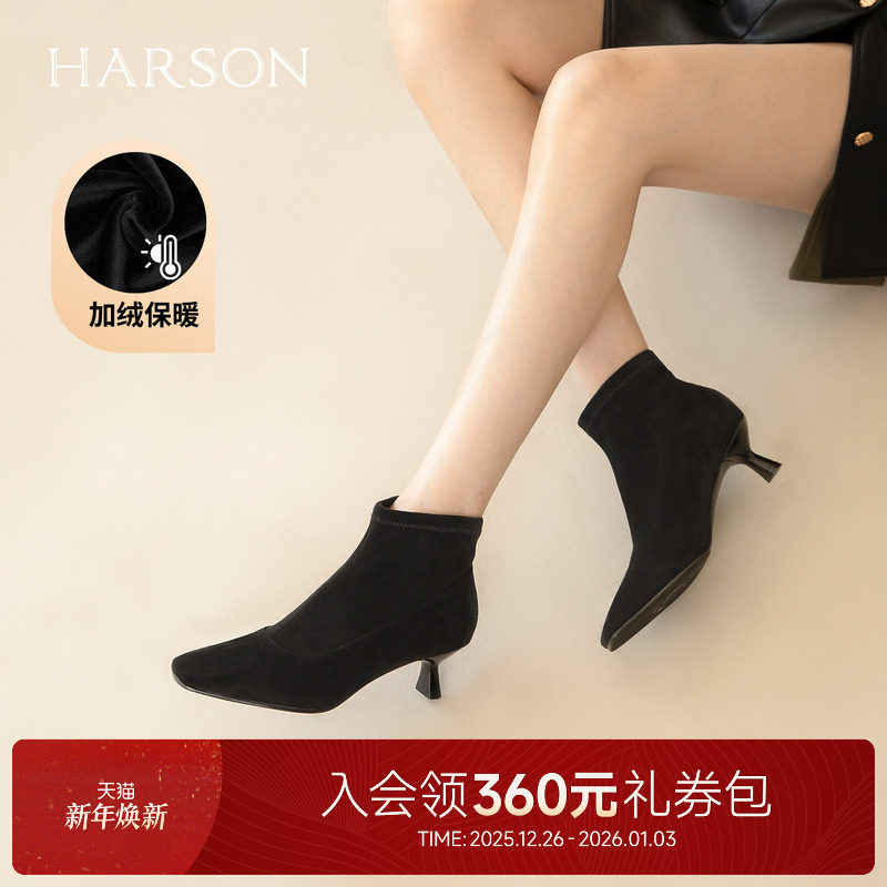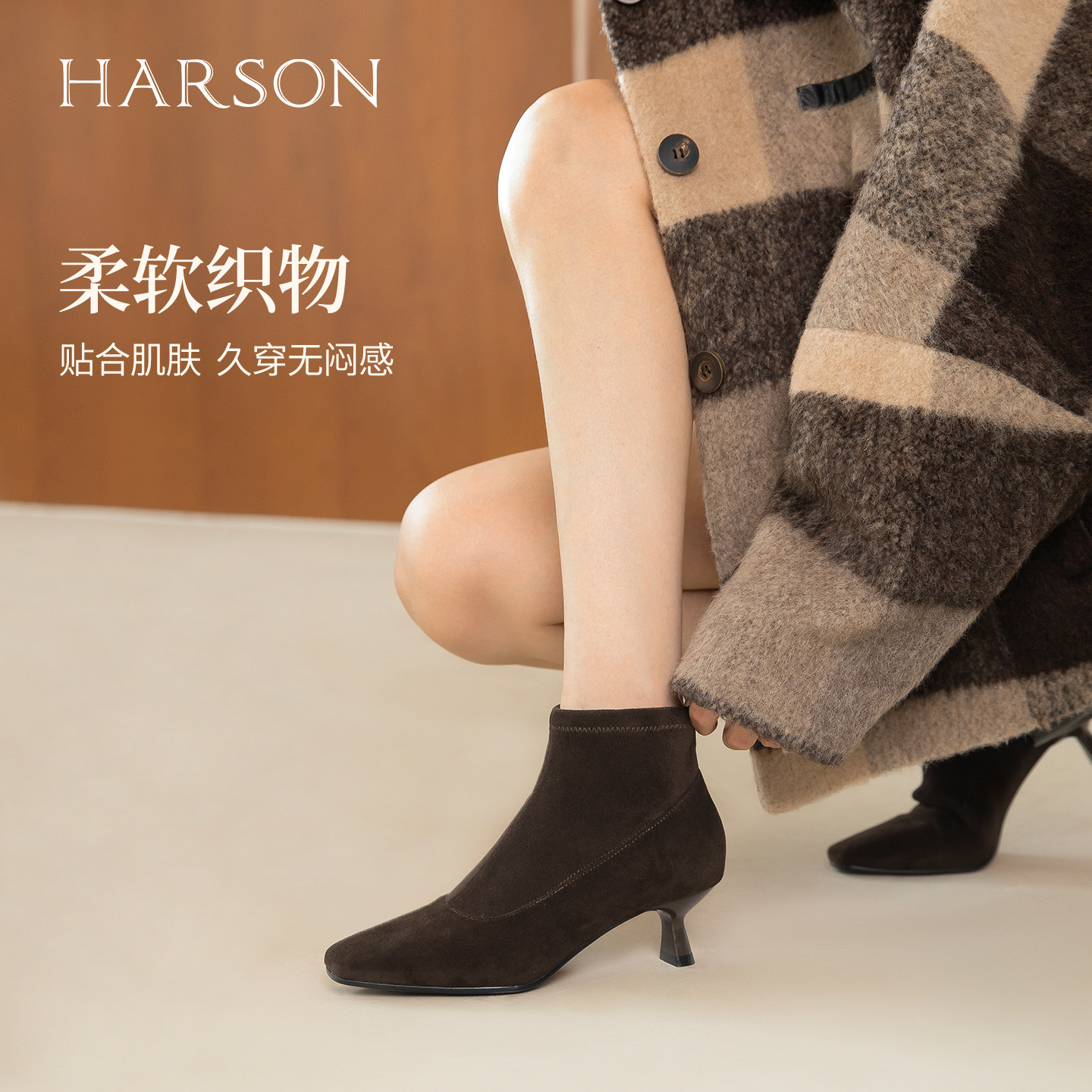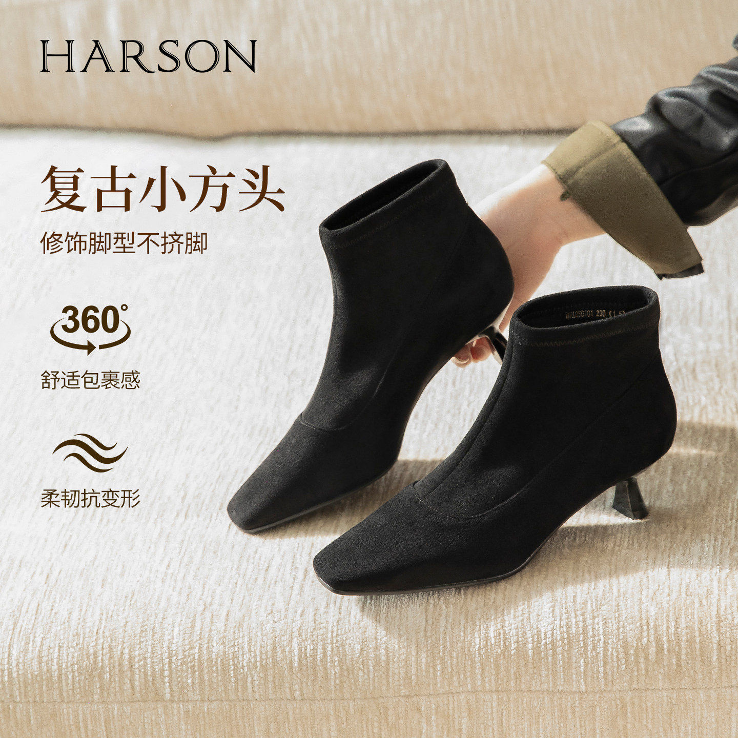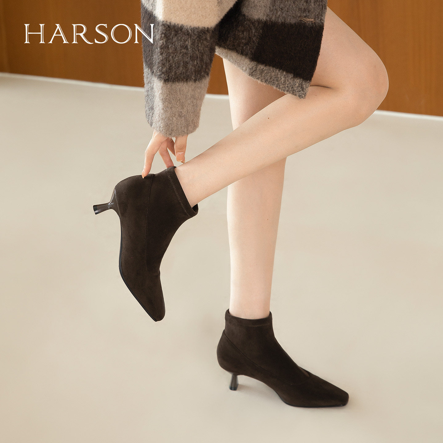哈森时尚瘦瘦靴女冬季新款复古百搭细高跟方头短靴HWA250101