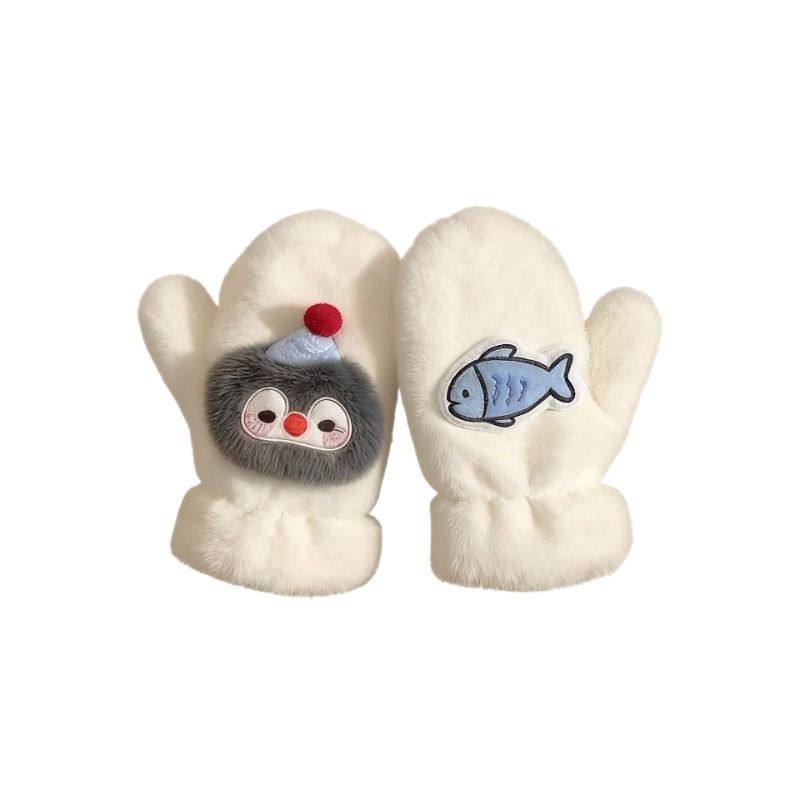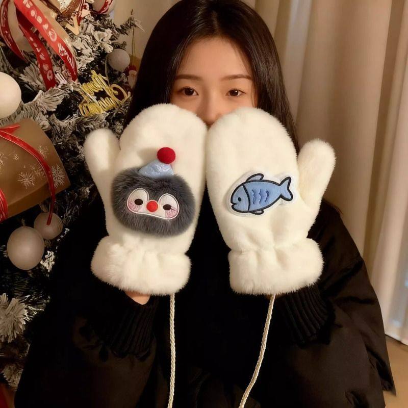 可爱毛绒手套冬季女款加绒学生骑车冬天挂脖企鹅防寒保暖连指全包