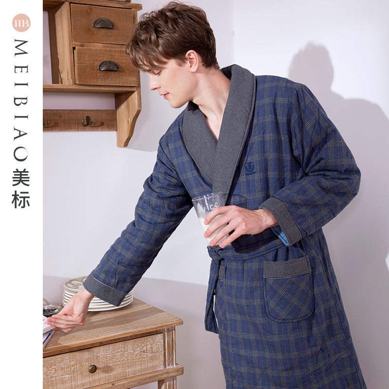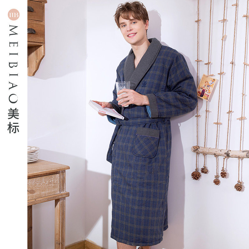 美标秋冬男士三层加厚保暖夹棉睡衣纯棉睡袍全棉质休闲格子家居服