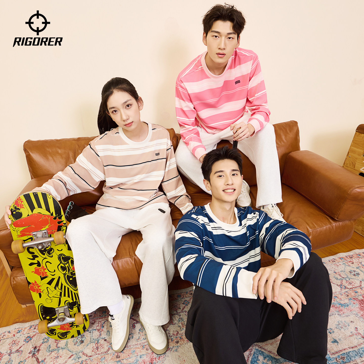 准者华夫格运动长袖T恤男女秋季新款情侣美式复古条纹潮休闲上衣