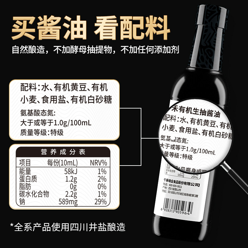 千禾有机生抽酱油500ml0添加非转基因黄豆特级酿造宿舍调味品家用