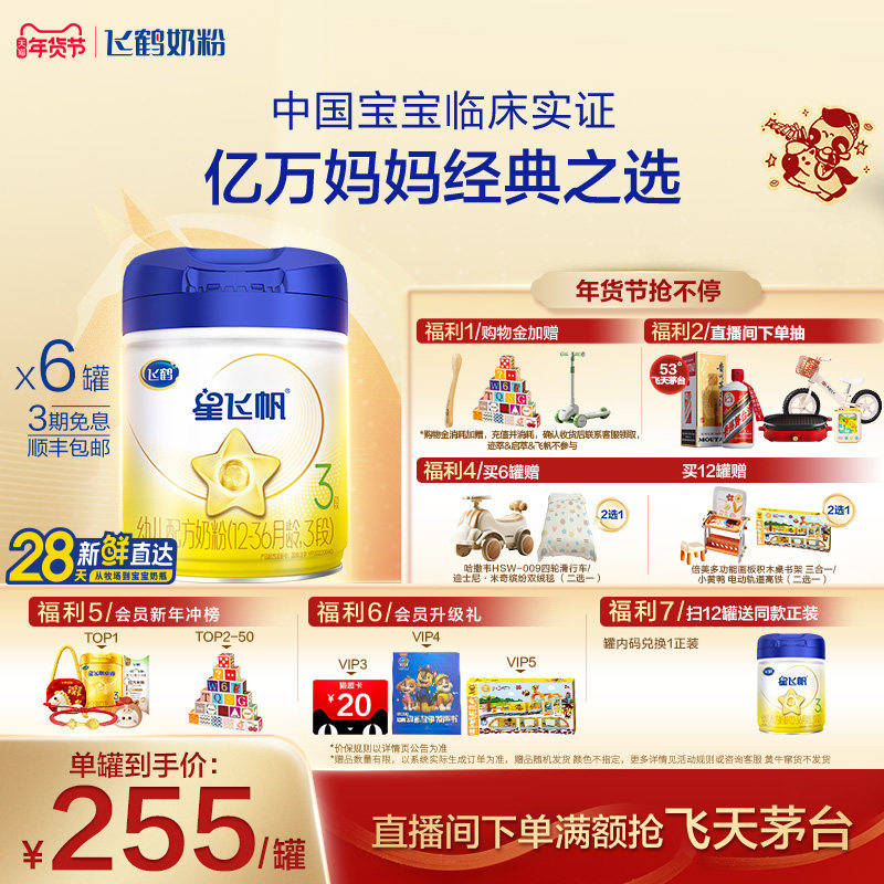 【官方正品】飞鹤星飞帆3段婴幼儿配方牛奶粉900g*6罐5HMO专利OPO