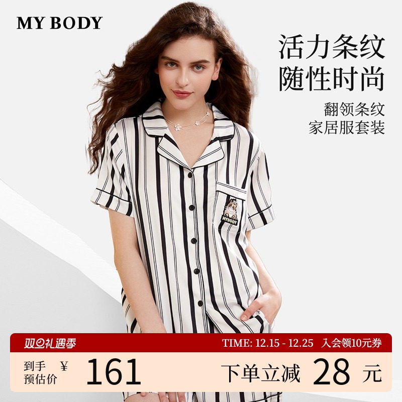 MYBODY商场同款睡衣女新款时尚条纹宽松短袖短裤家居服套装可外穿