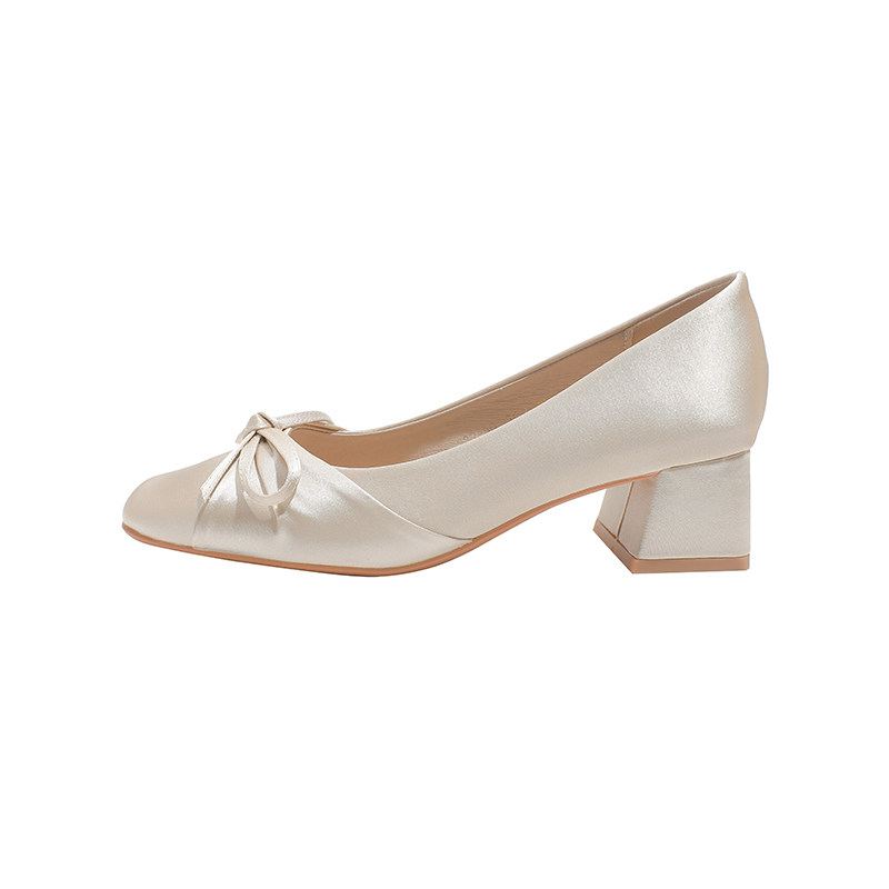 真皮~骄屿法式仙女风高跟鞋女婚鞋玛丽珍鞋珍珠系蝴蝶结粗跟单鞋
