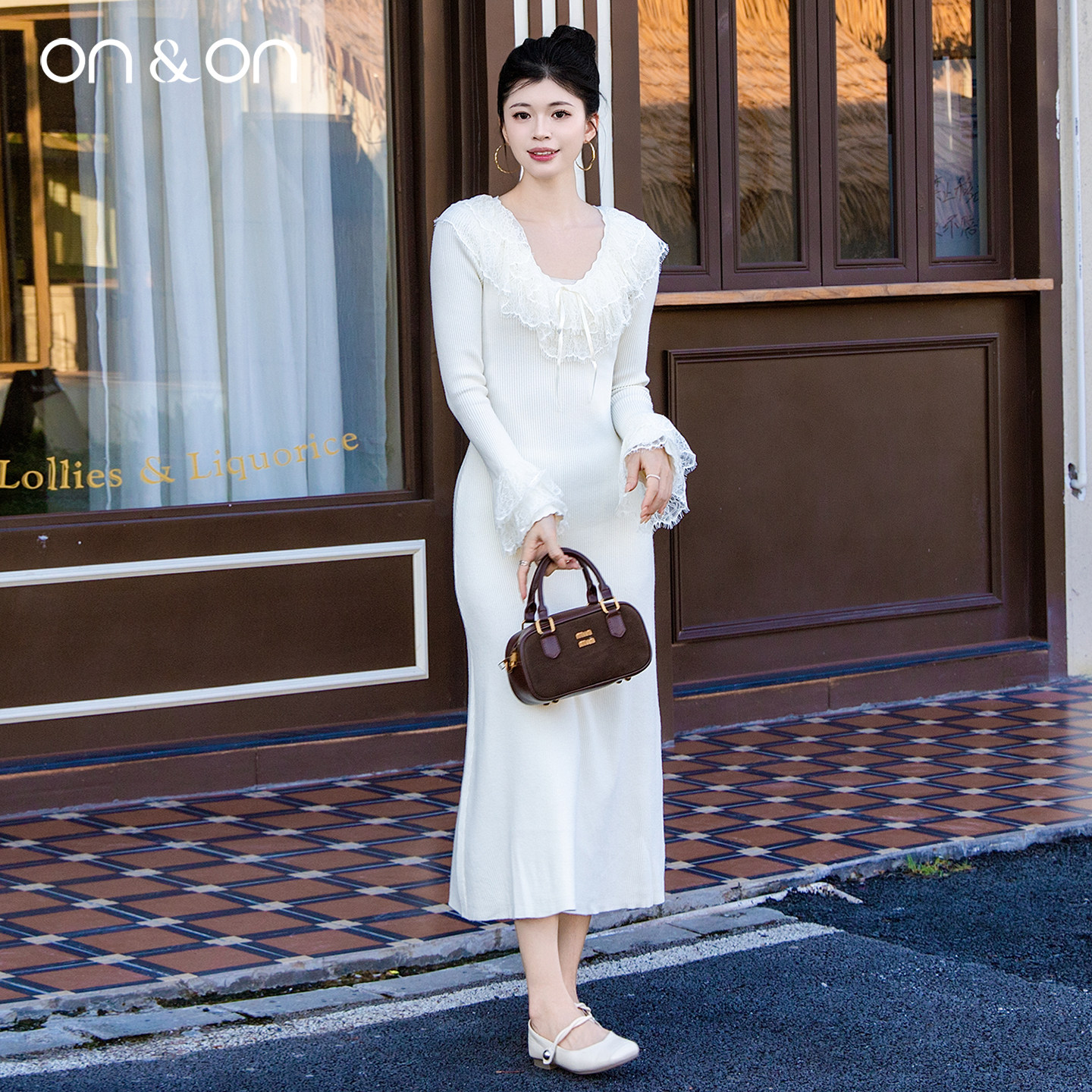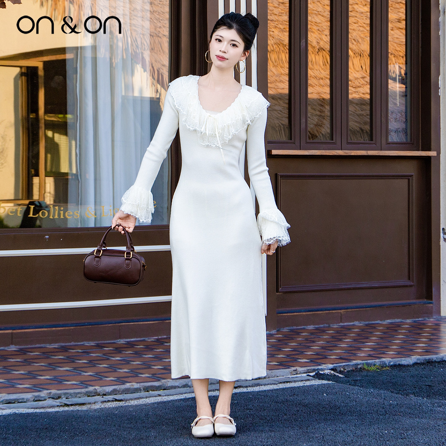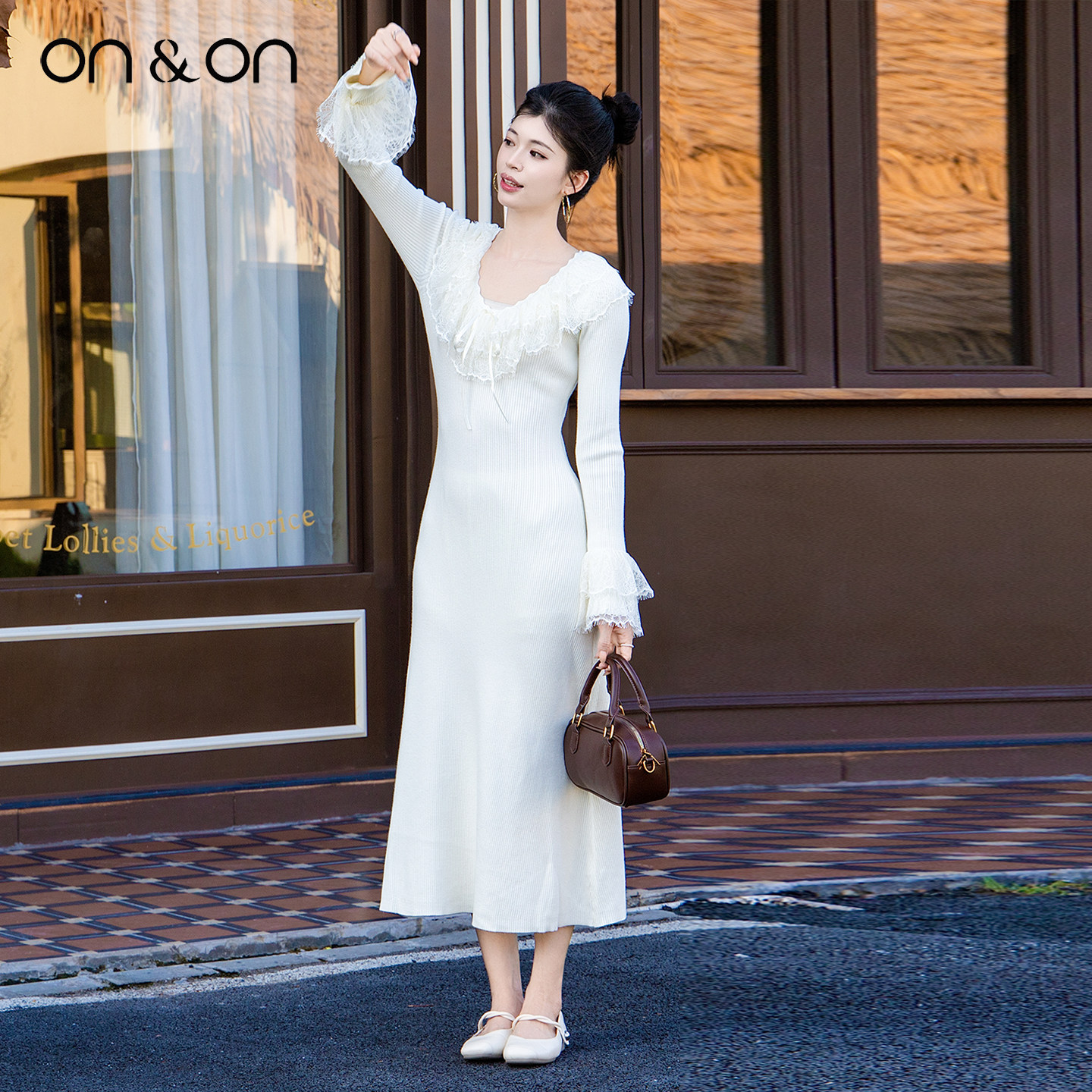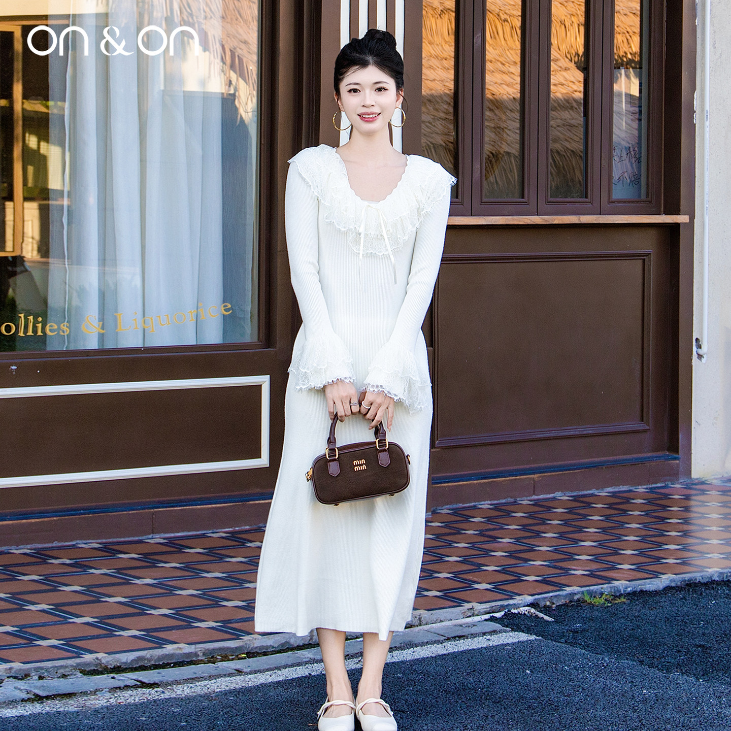 ON&ON/安乃安2025冬季新款法式复古双层蕾丝荷叶边浪漫针织长裙
