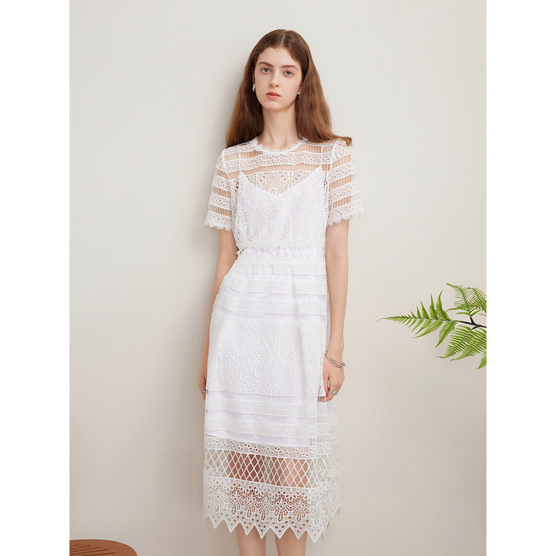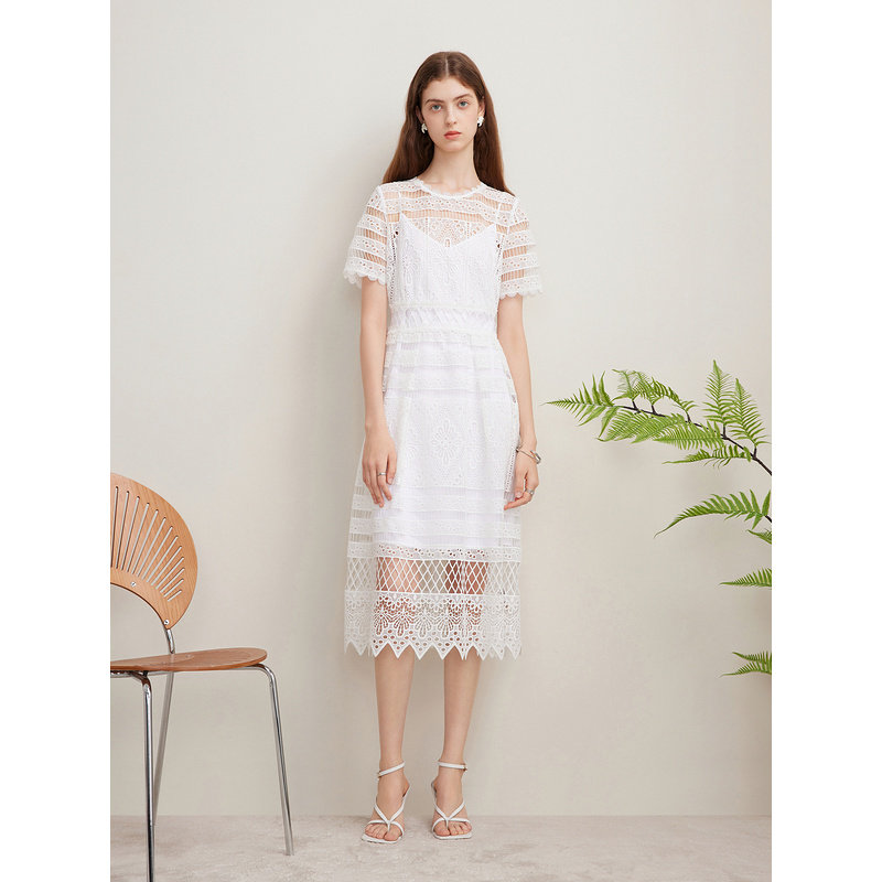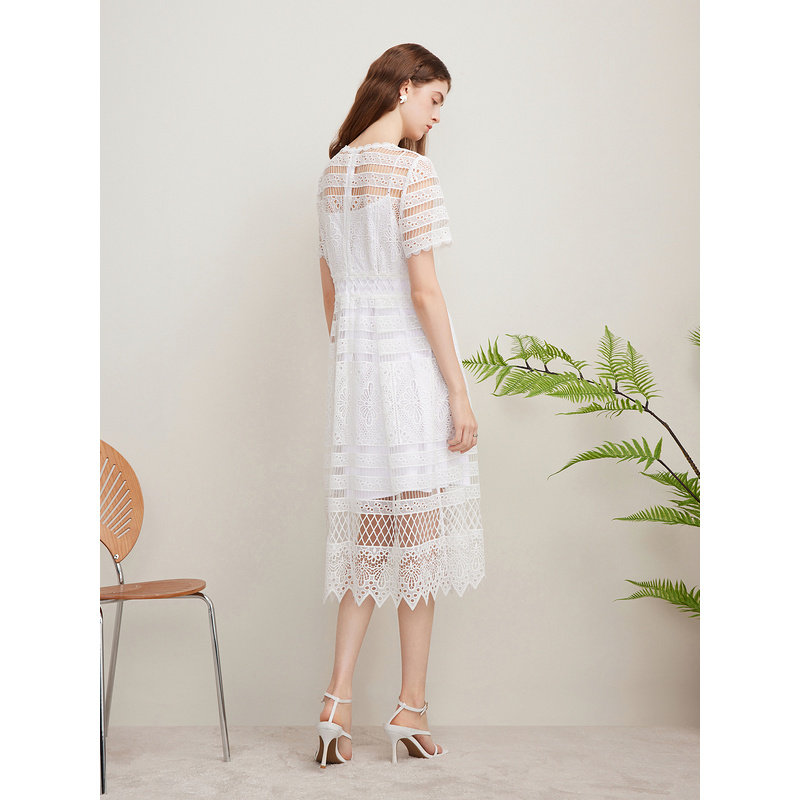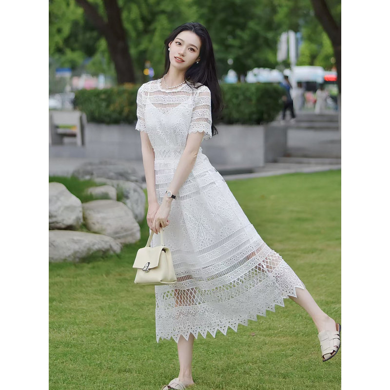 Goodland美地夏季法式优雅艺术小白裙镂空蕾丝连衣裙
