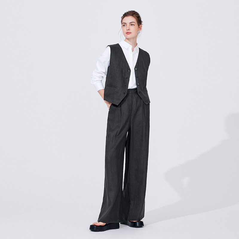 双侧带口袋棉绸绵绸人造棉高腰显瘦直筒裤女宽松休闲百搭阔腿长裤