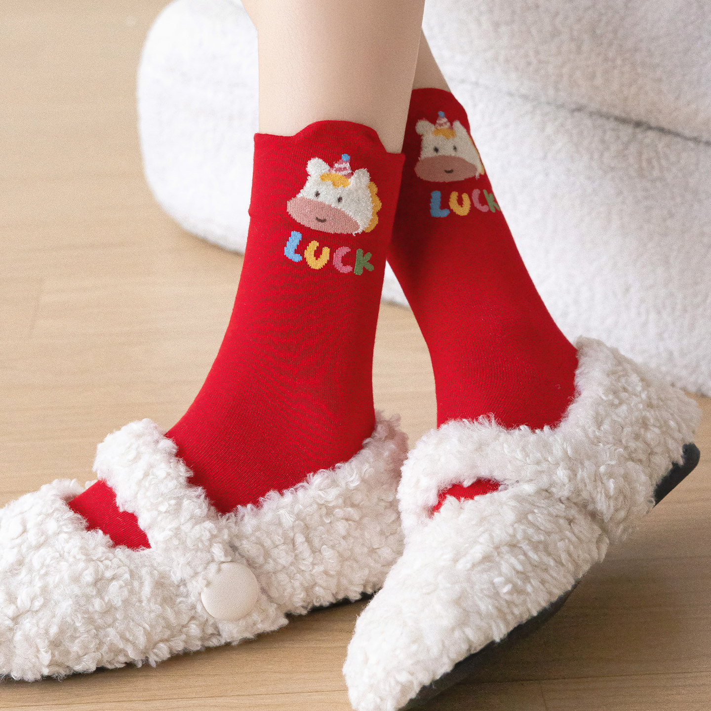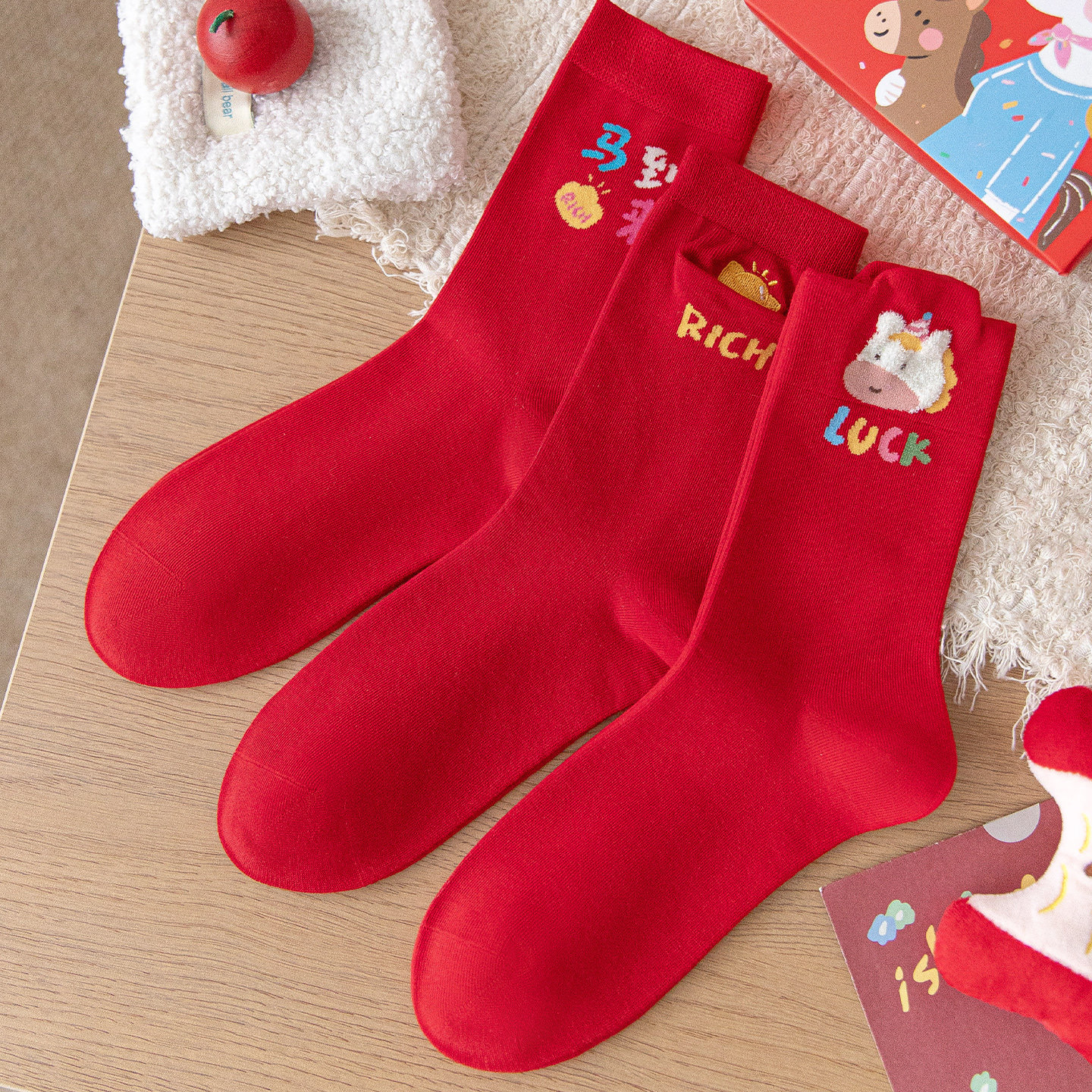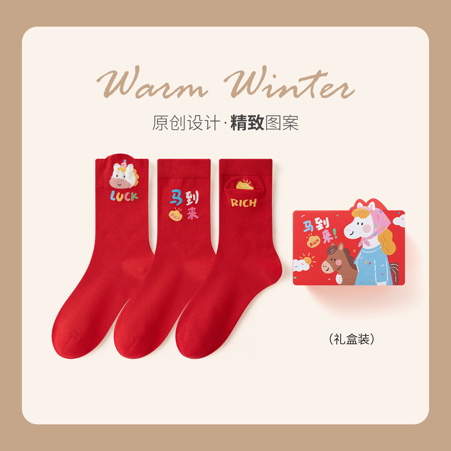 卡拉美拉秋冬新款本命年红色中筒袜女卡通小马好运袜新年礼物袜子