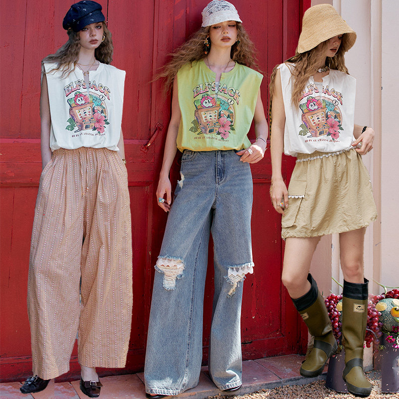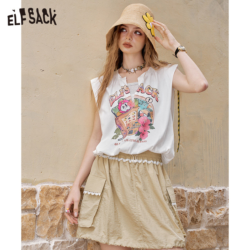 妖精的口袋白色卡通印花无袖t恤女2025年夏季新款修身设计感上衣
