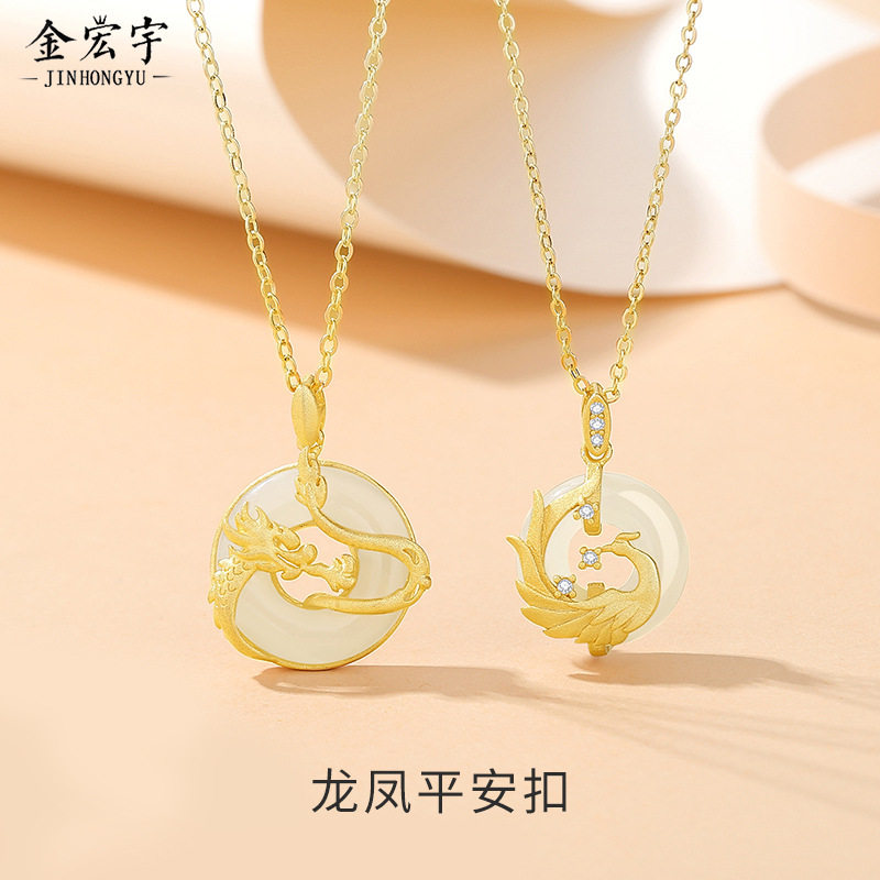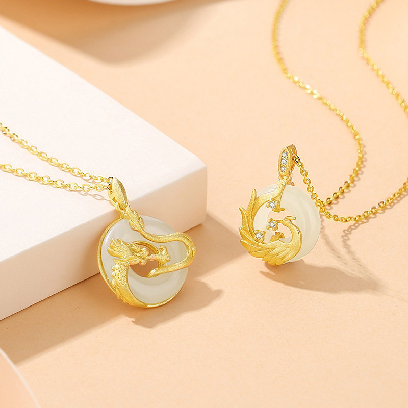 原创龙凤呈祥平安扣情侣项链纯银复古中国风宫廷吊坠古法金锁骨链