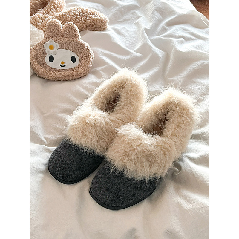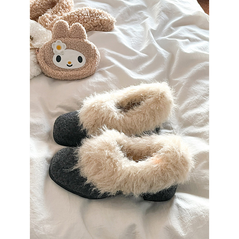 法式方头呢子加绒毛毛玛丽珍鞋女2025秋冬季新款浅口粗跟保暖棉鞋