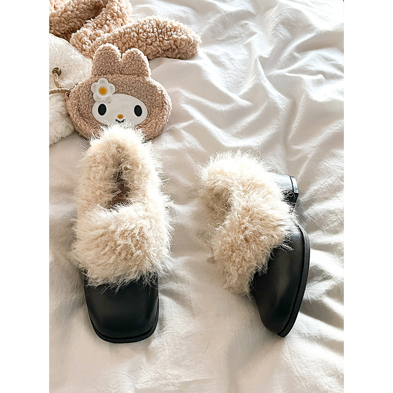 羊皮版复古玛丽珍鞋女方头秋冬季加绒保暖毛毛棉鞋平底晚晚单鞋女