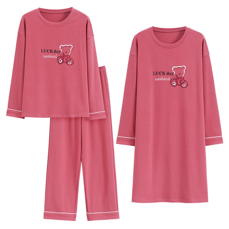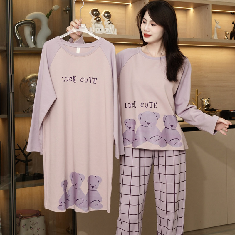 三件套睡衣女款春秋季长袖过膝针织睡裙简约长裤春秋款套装家居服