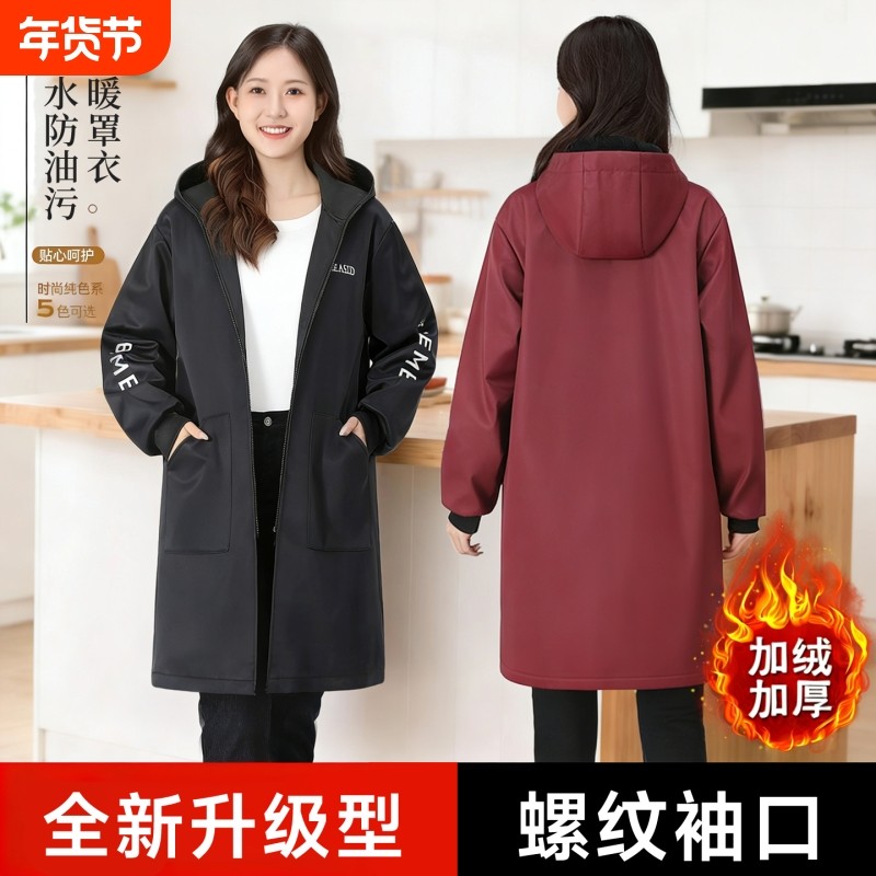 罩衣女新款加绒加厚围裙工作服成人防水防油厨房家用干活外套冬季