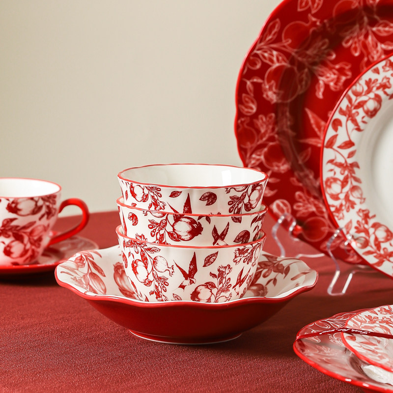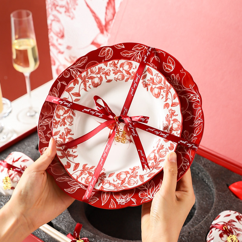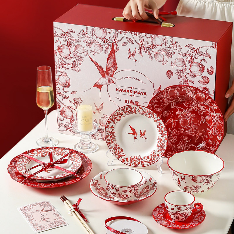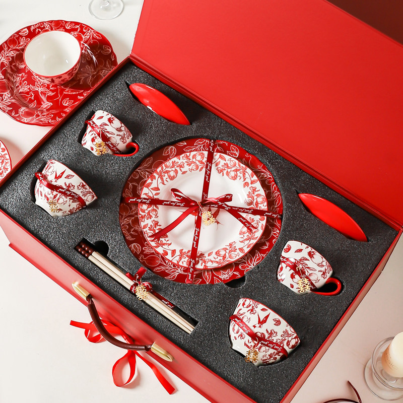 高档碗碟餐具陶瓷新婚礼物送新娘红色碗盘筷套装乔迁新居结婚礼盒