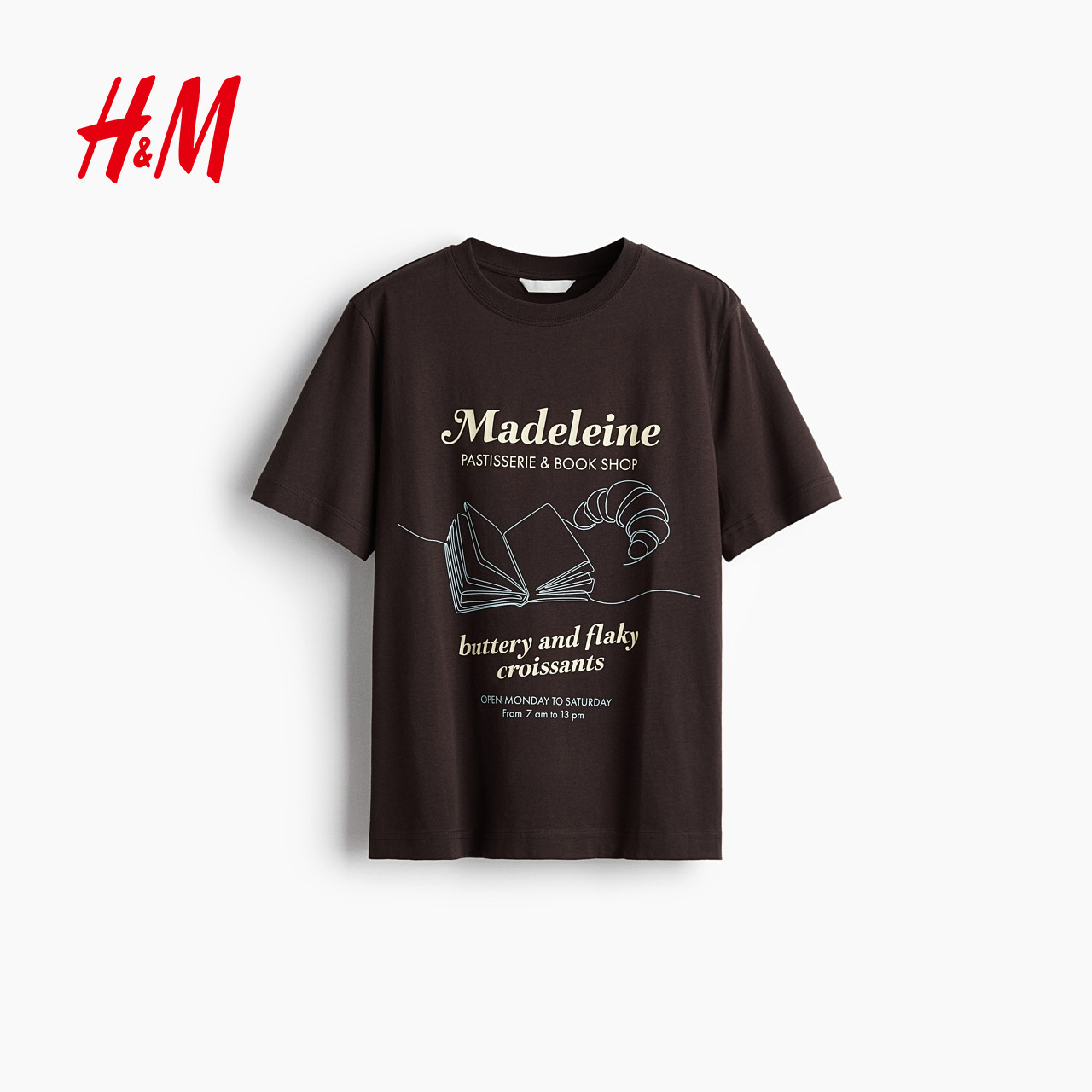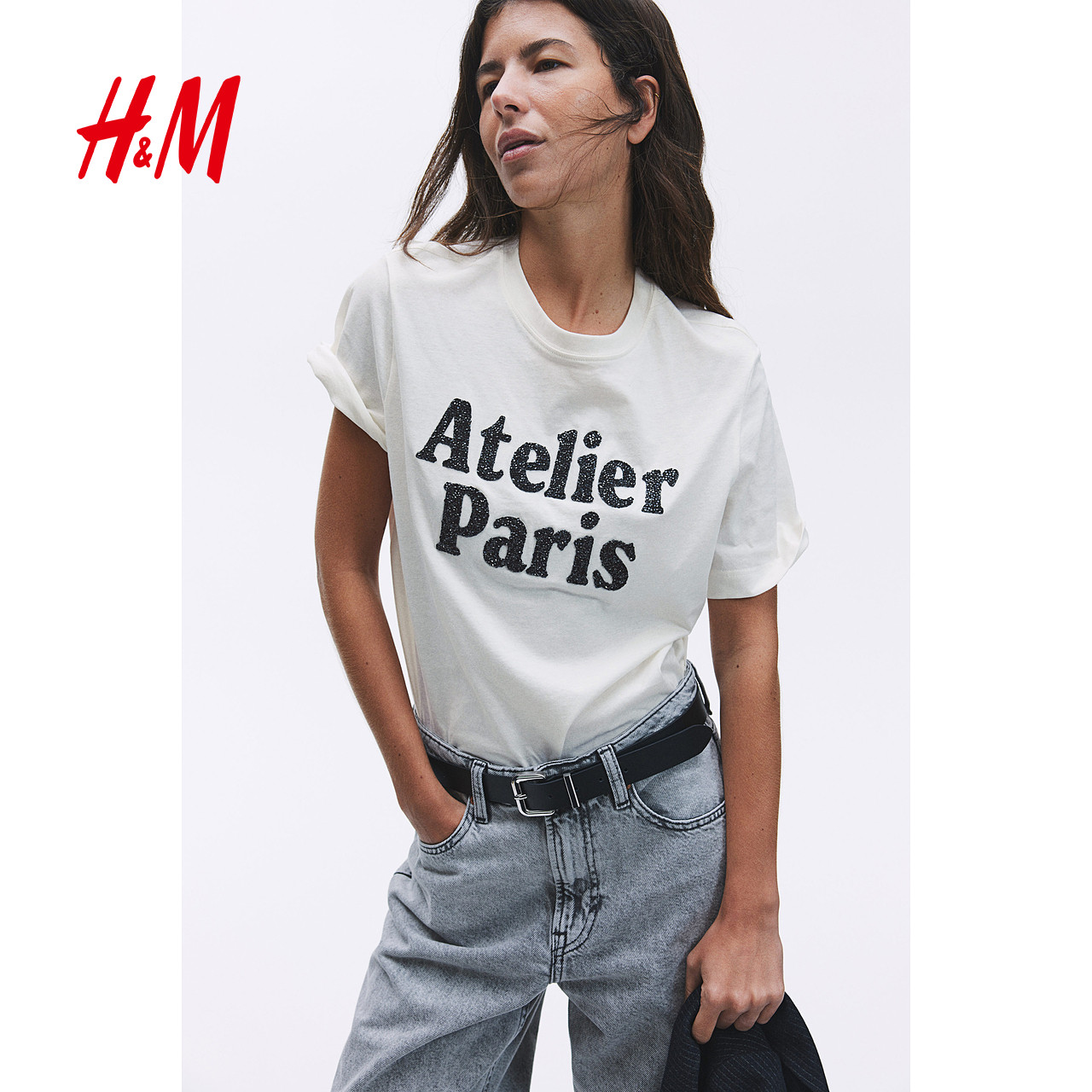 HM女装T恤春季美式圆领红色字母印花棉质短袖上衣1274171
